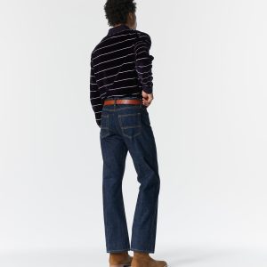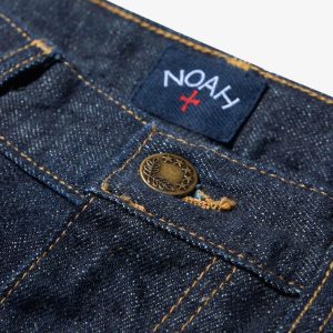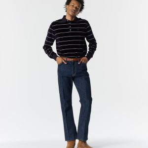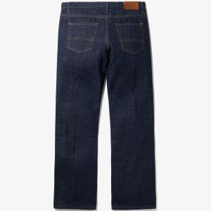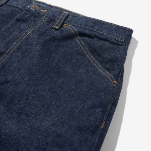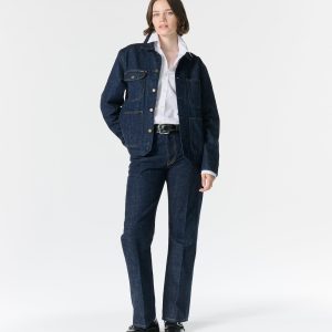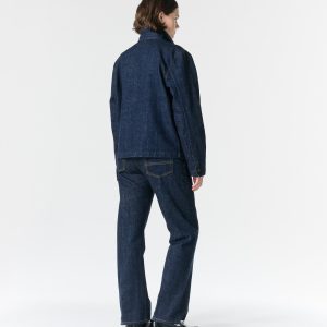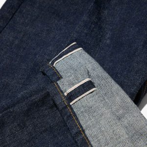 Made in the USA. 100% ringspun cotton: 60% regular cotton. 20% recycled cotton. 20% fallen cotton. 13.4oz Japanese 3/1 selvedge denim with nep and a sanforized finish. Dyed with natural indigo. Metal shank button and zip-fly closure. Slanted front pockets. Back patch pockets. Slightly more tailored fit through the thigh and leg but wide enough to fit over a boot. Jamier is 6’1 and wearing size 32. Hannah is 5’8 and wearing a size M