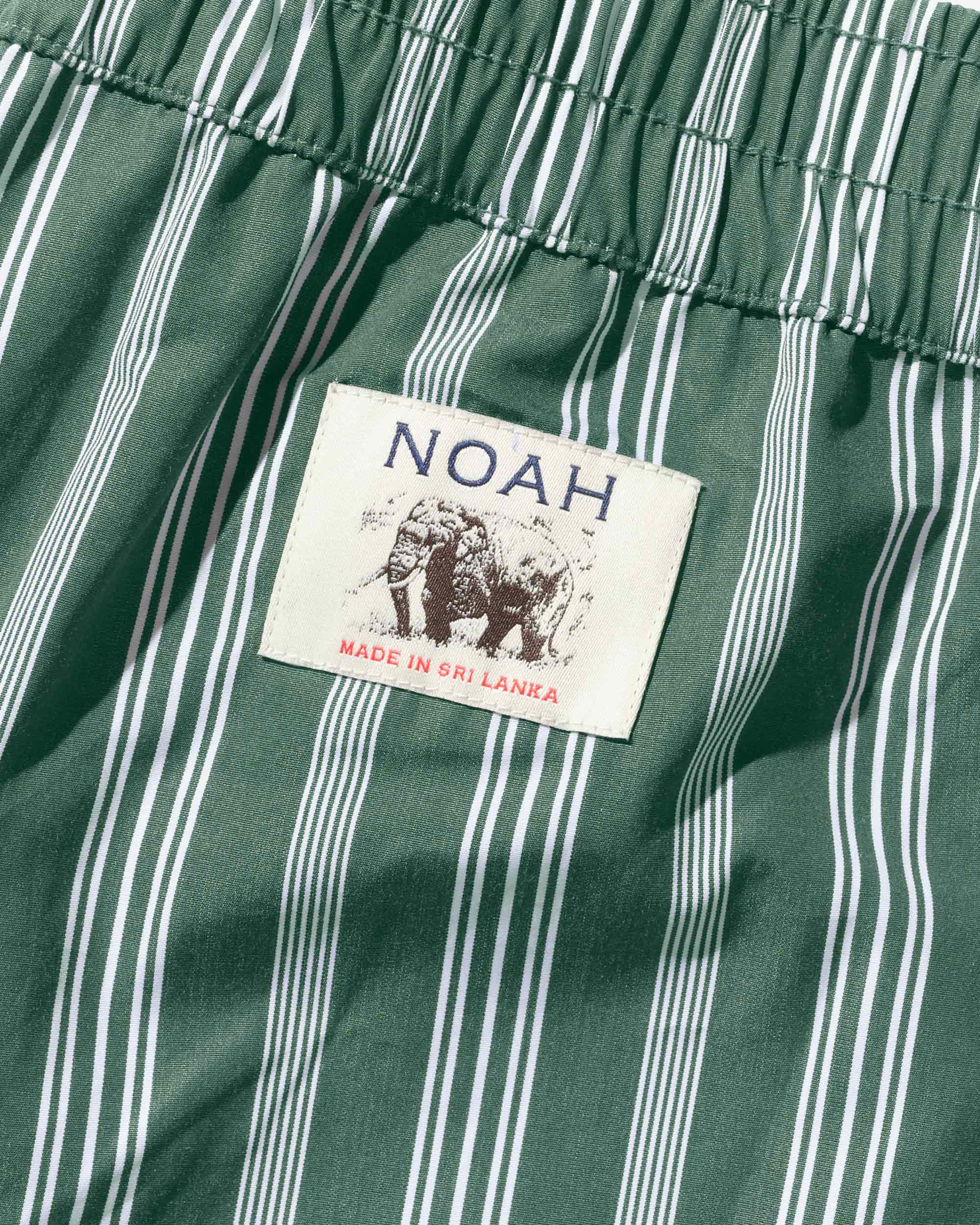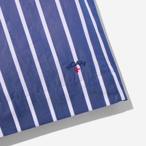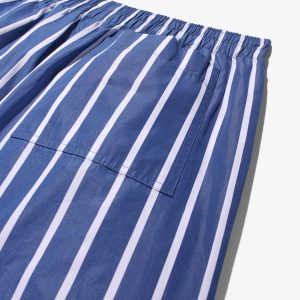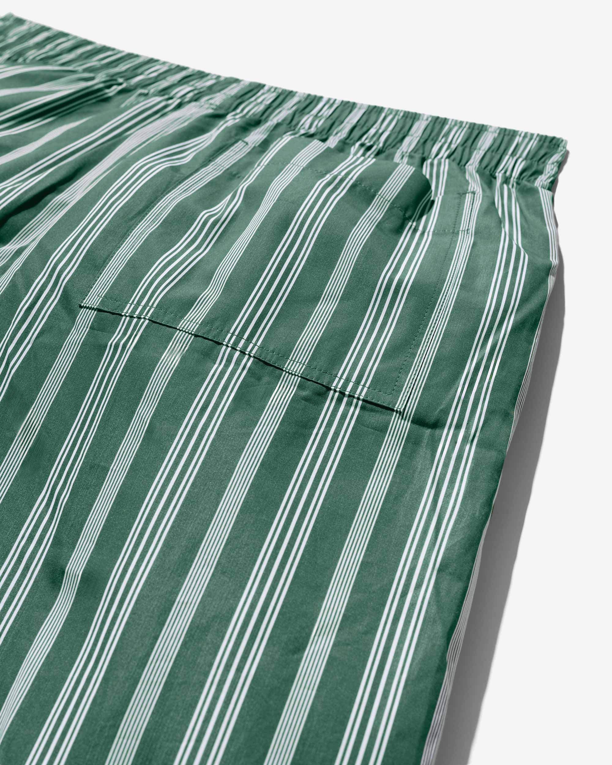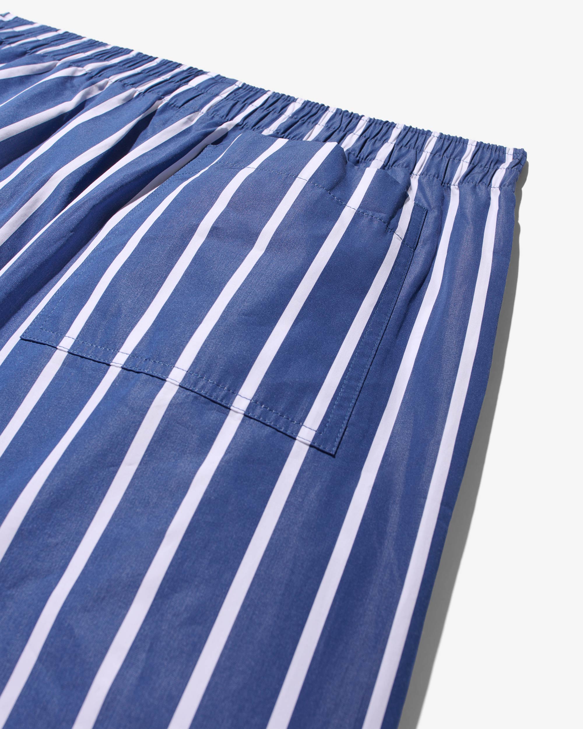 Made in Sri Lanka. 100% cotton poplin with yarn-dyed stripes. Elasticated waist with side seam pockets. Patch pocket on back. Embroidered logo above hem