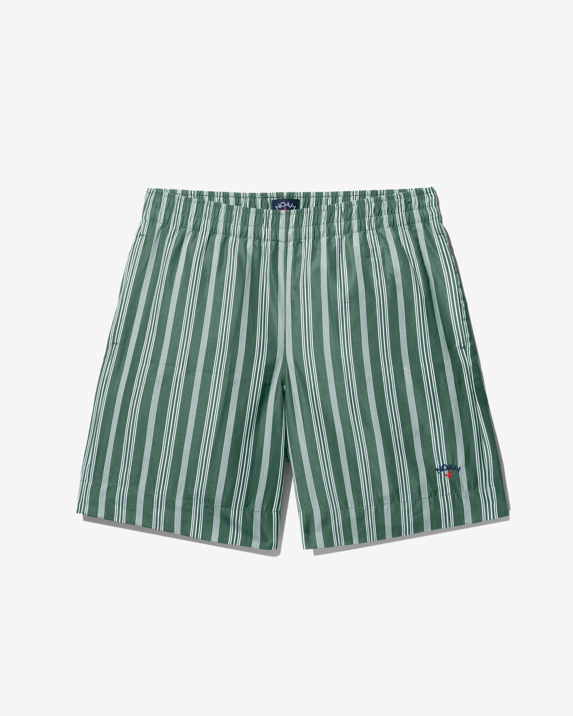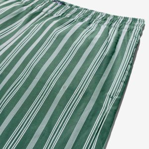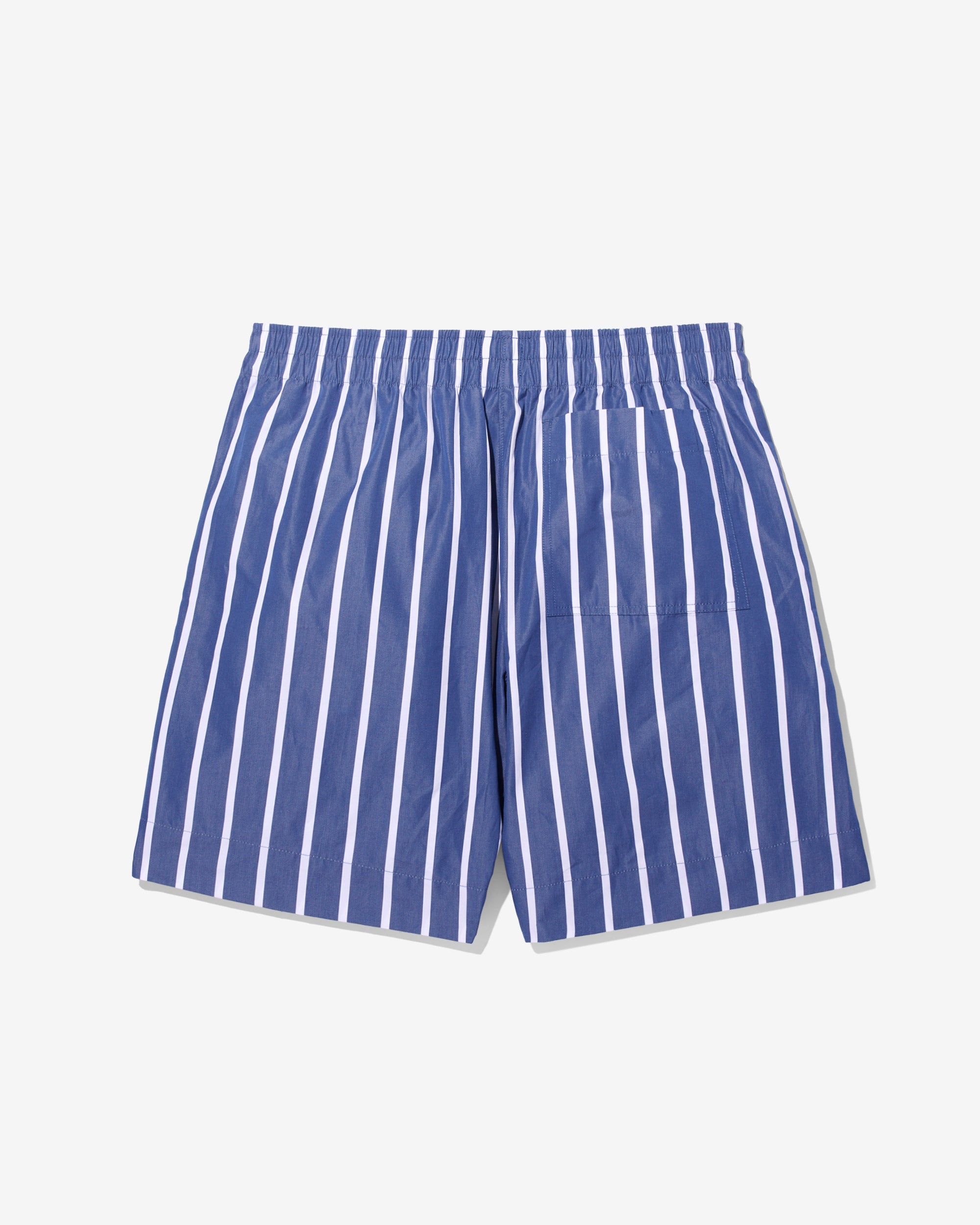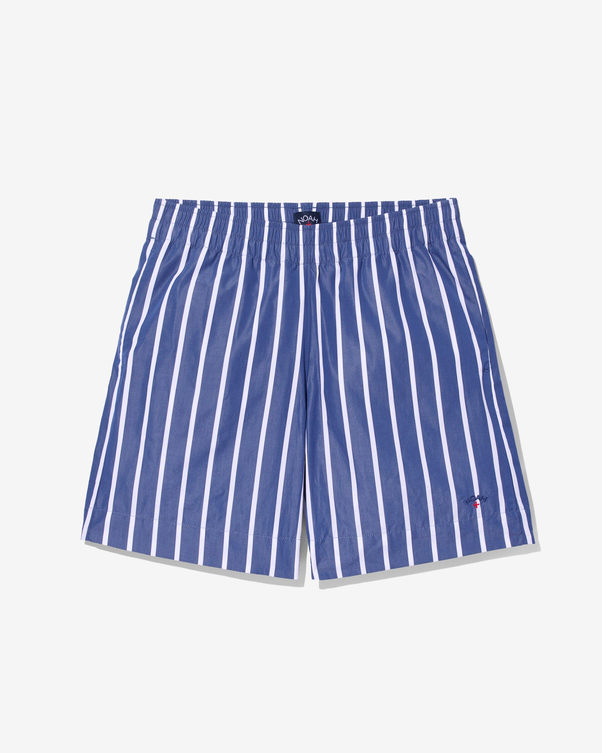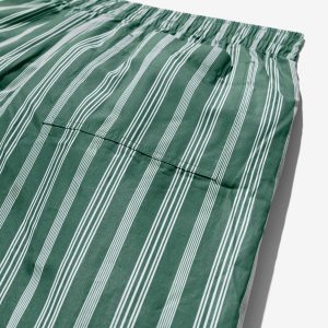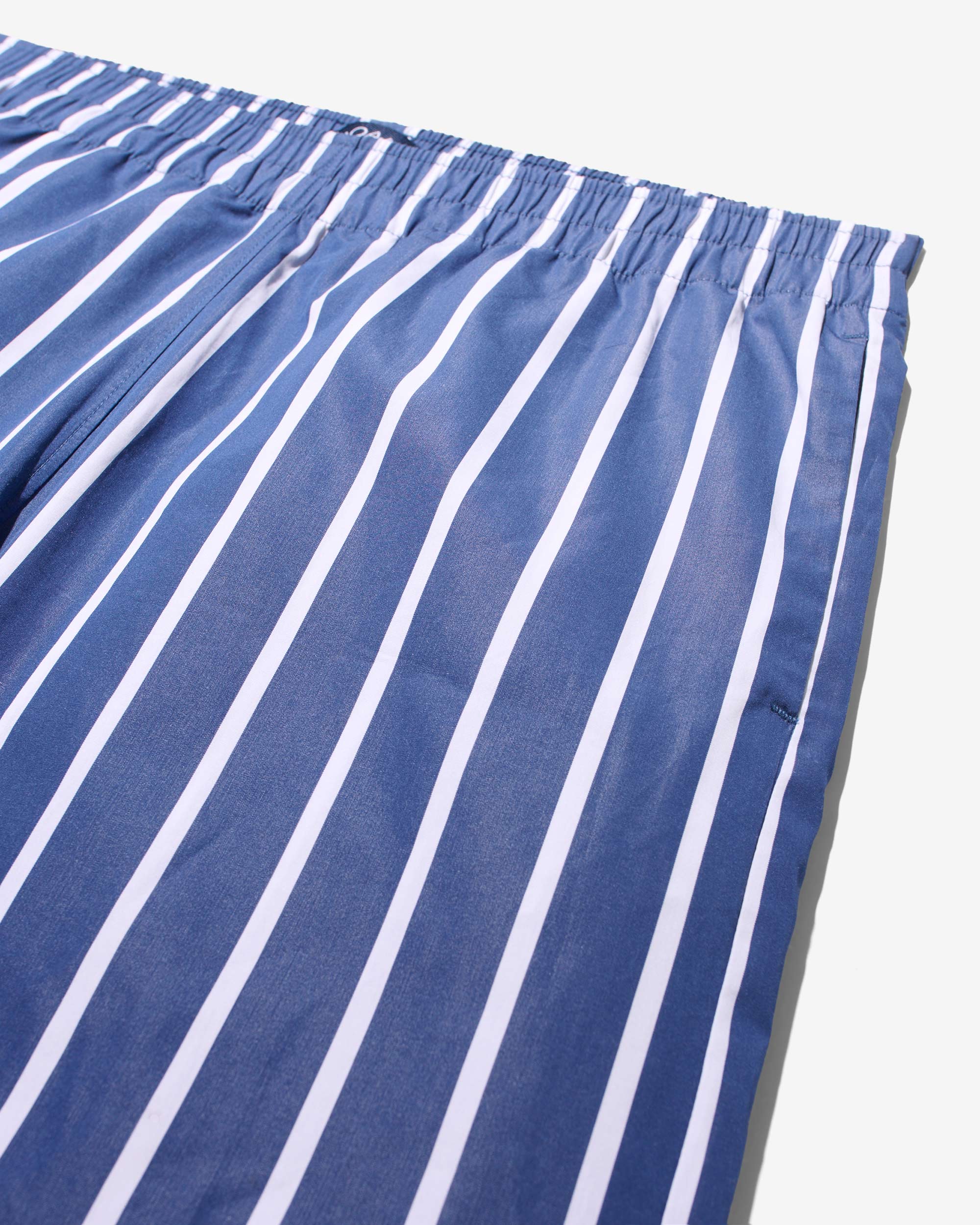 Made in Sri Lanka. 100% cotton poplin with yarn-dyed stripes. Elasticated waist with side seam pockets. Patch pocket on back. Embroidered logo above hem