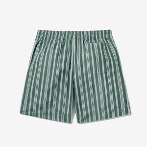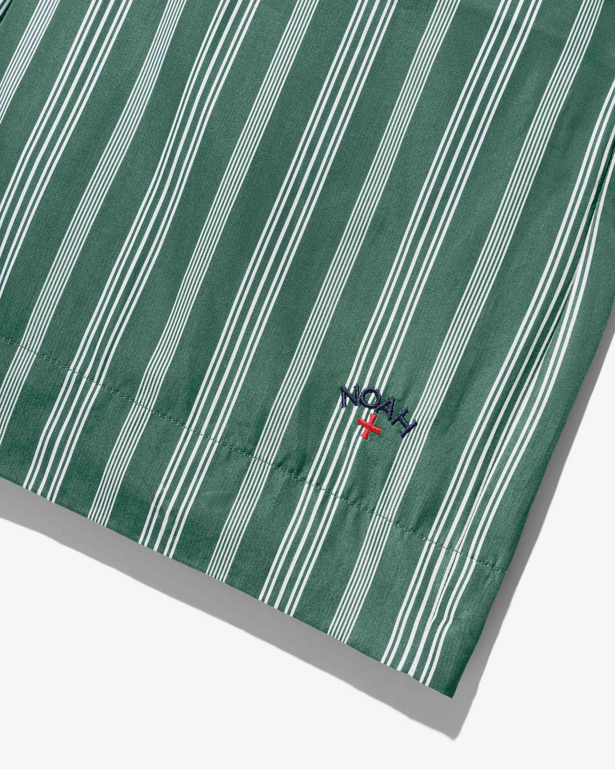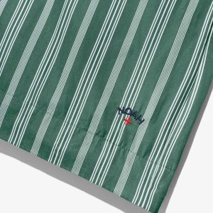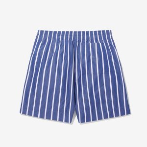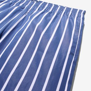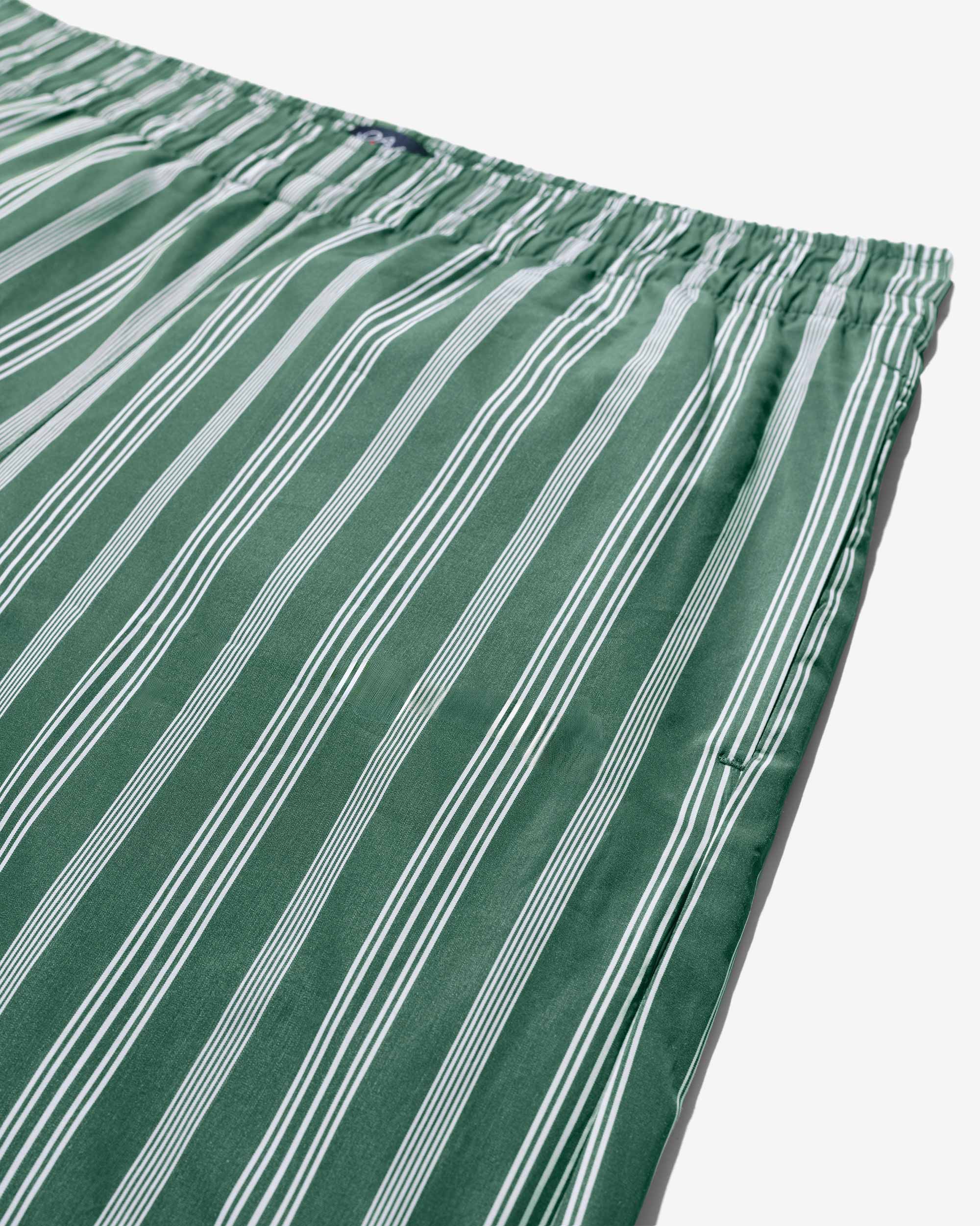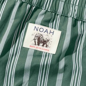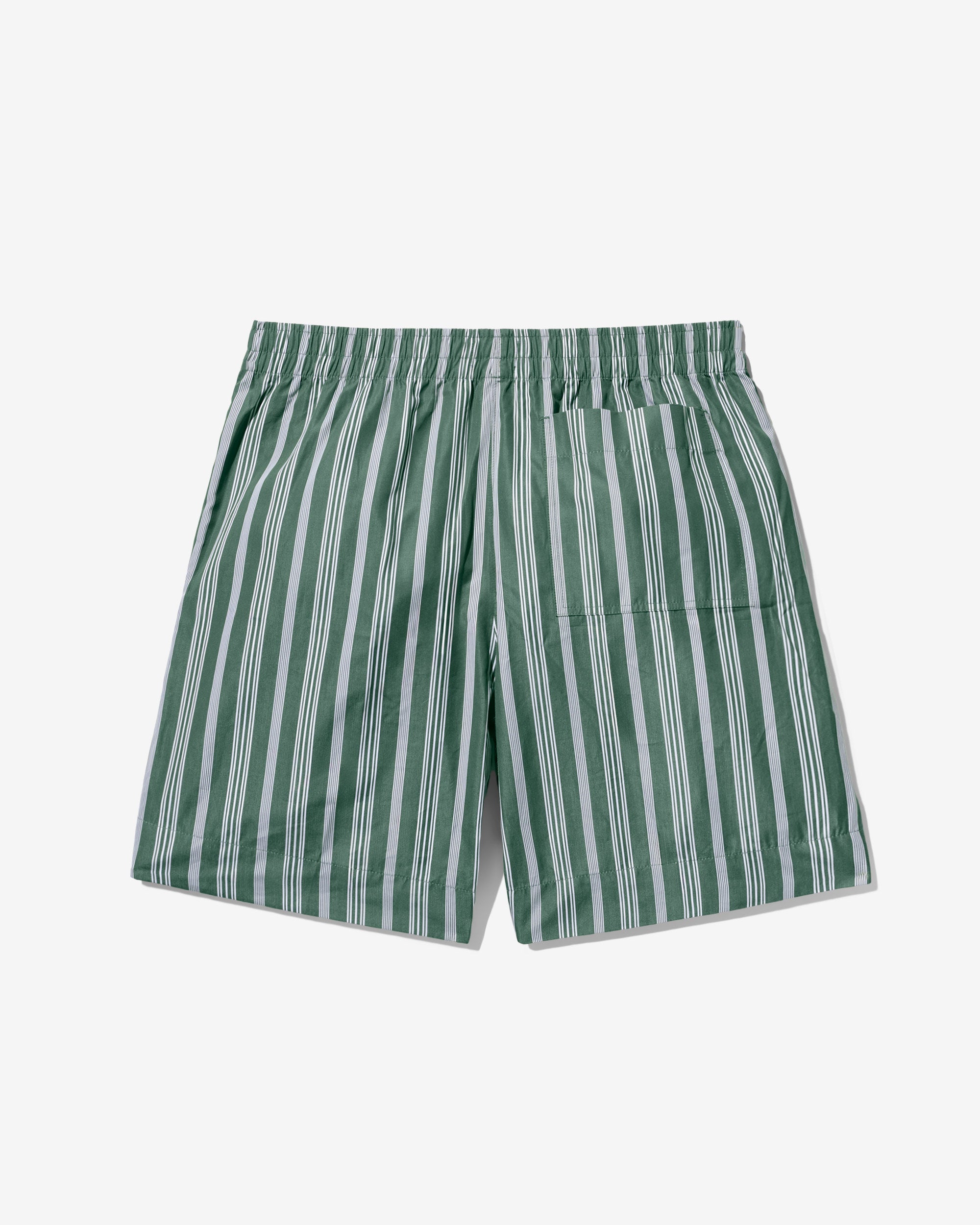 Made in Sri Lanka. 100% cotton poplin with yarn-dyed stripes. Elasticated waist with side seam pockets. Patch pocket on back. Embroidered logo above hem
