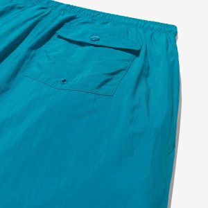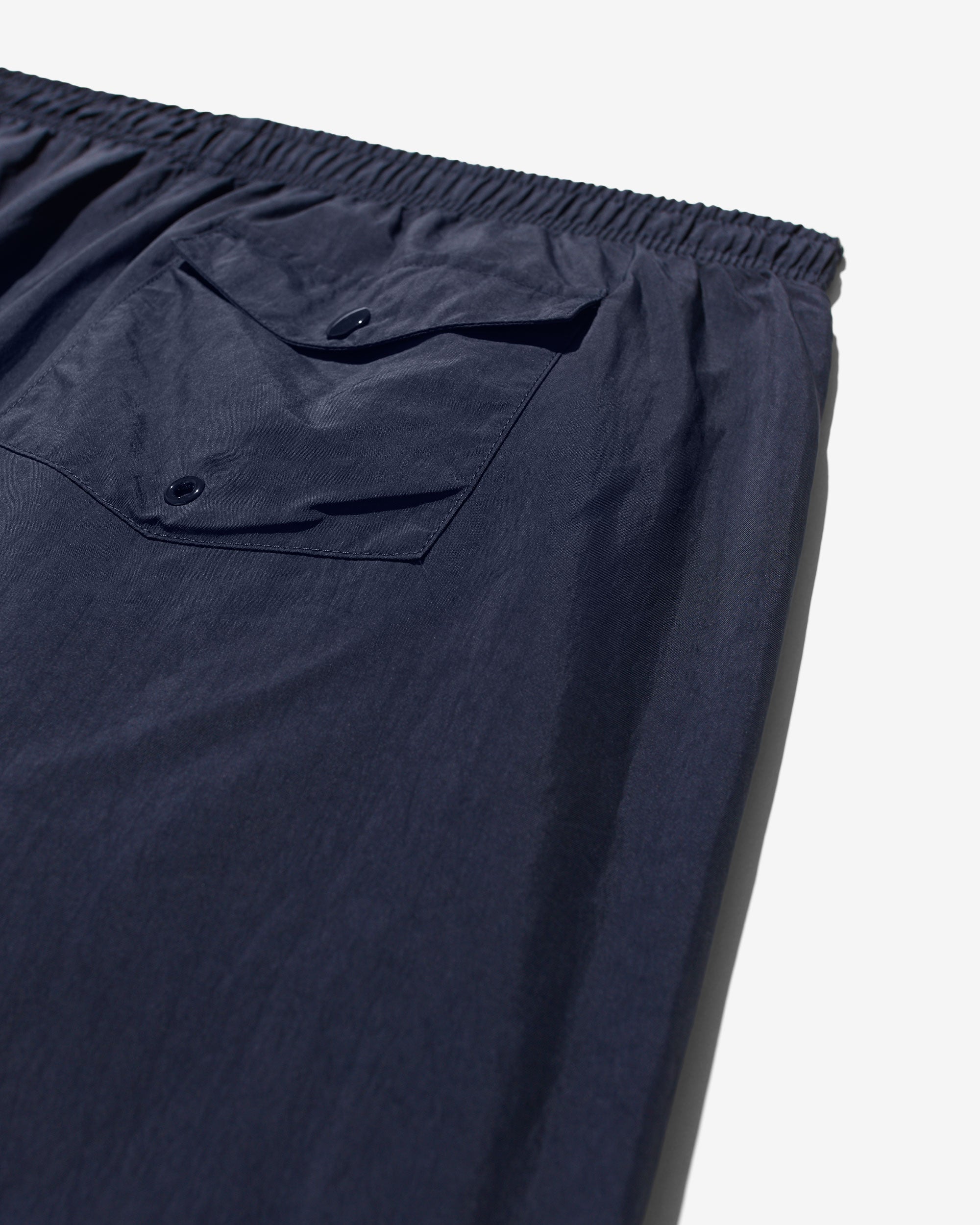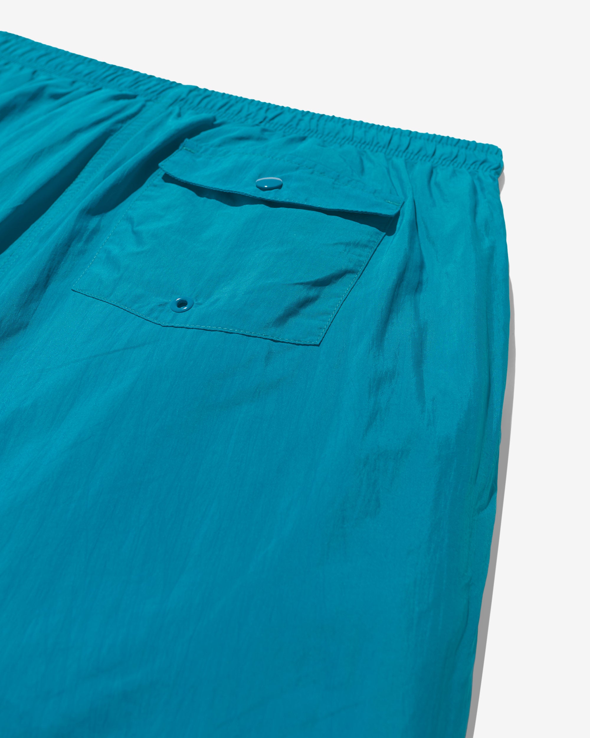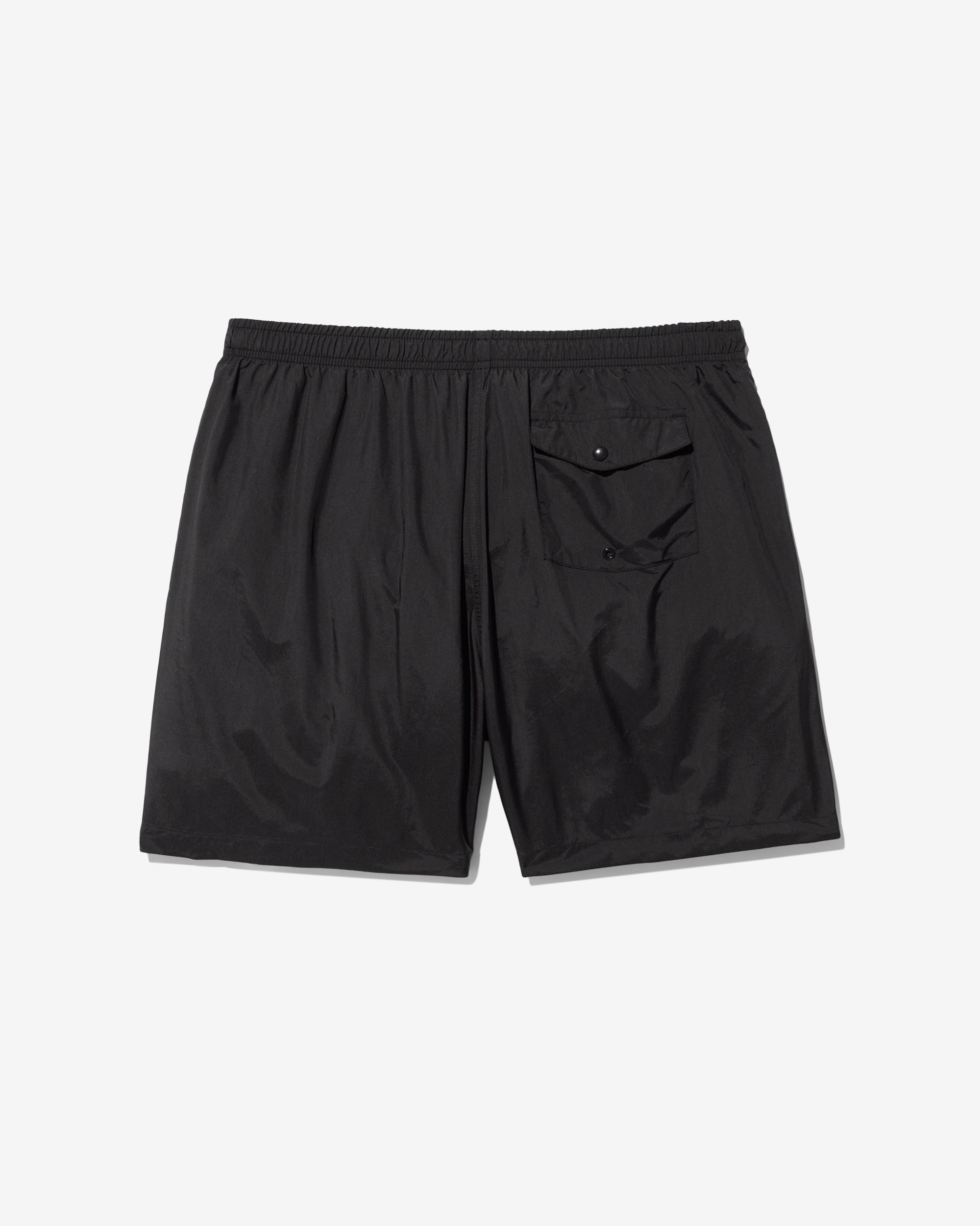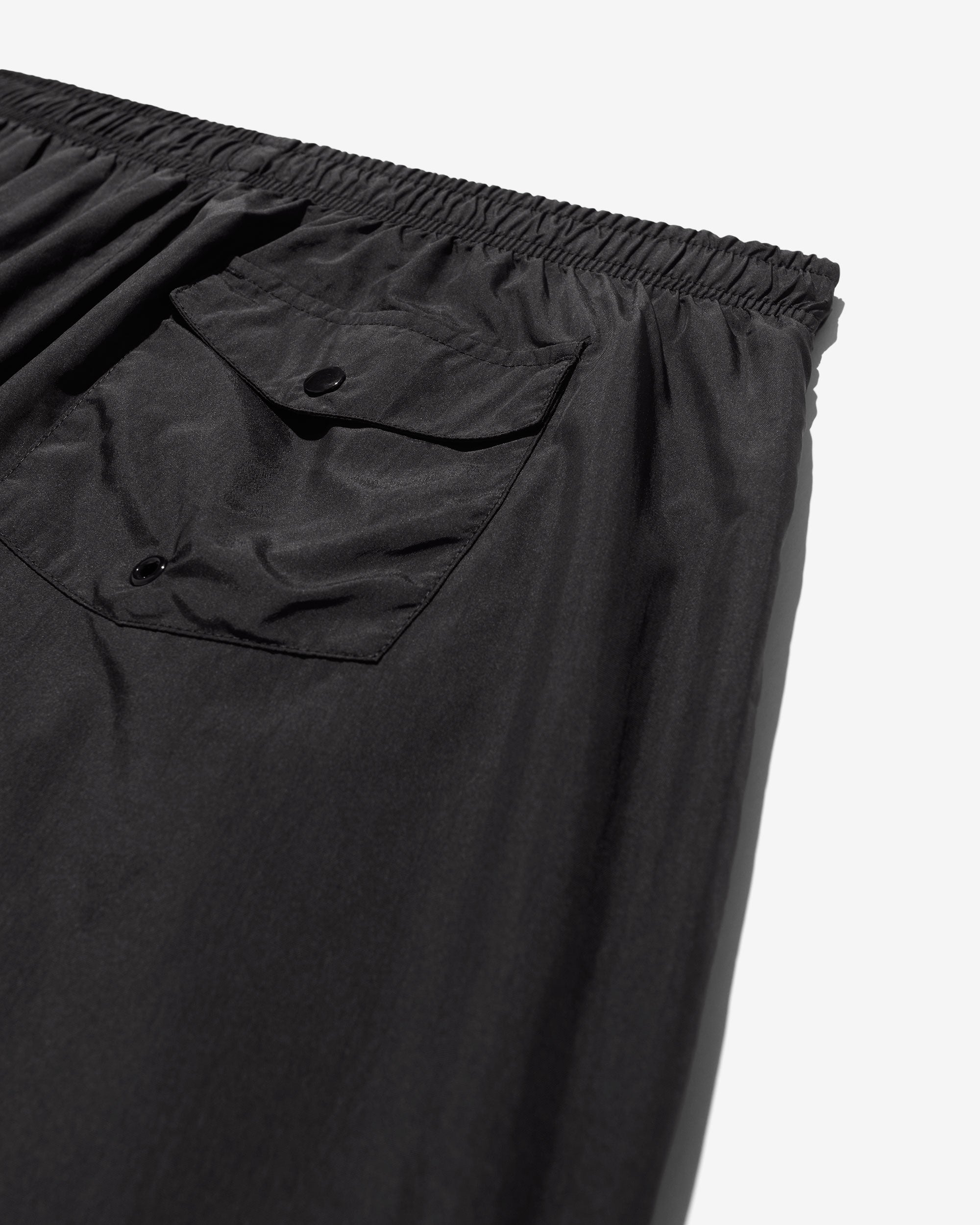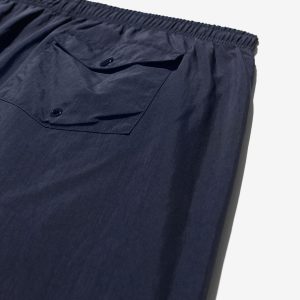 Made in Portugal. 100% crinkle nylon with nylon mesh liner. Elastic drawstring waist. On-seam front pockets. Flap back pocket with snap closure and drain vent