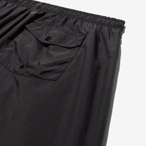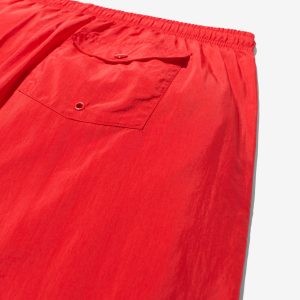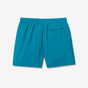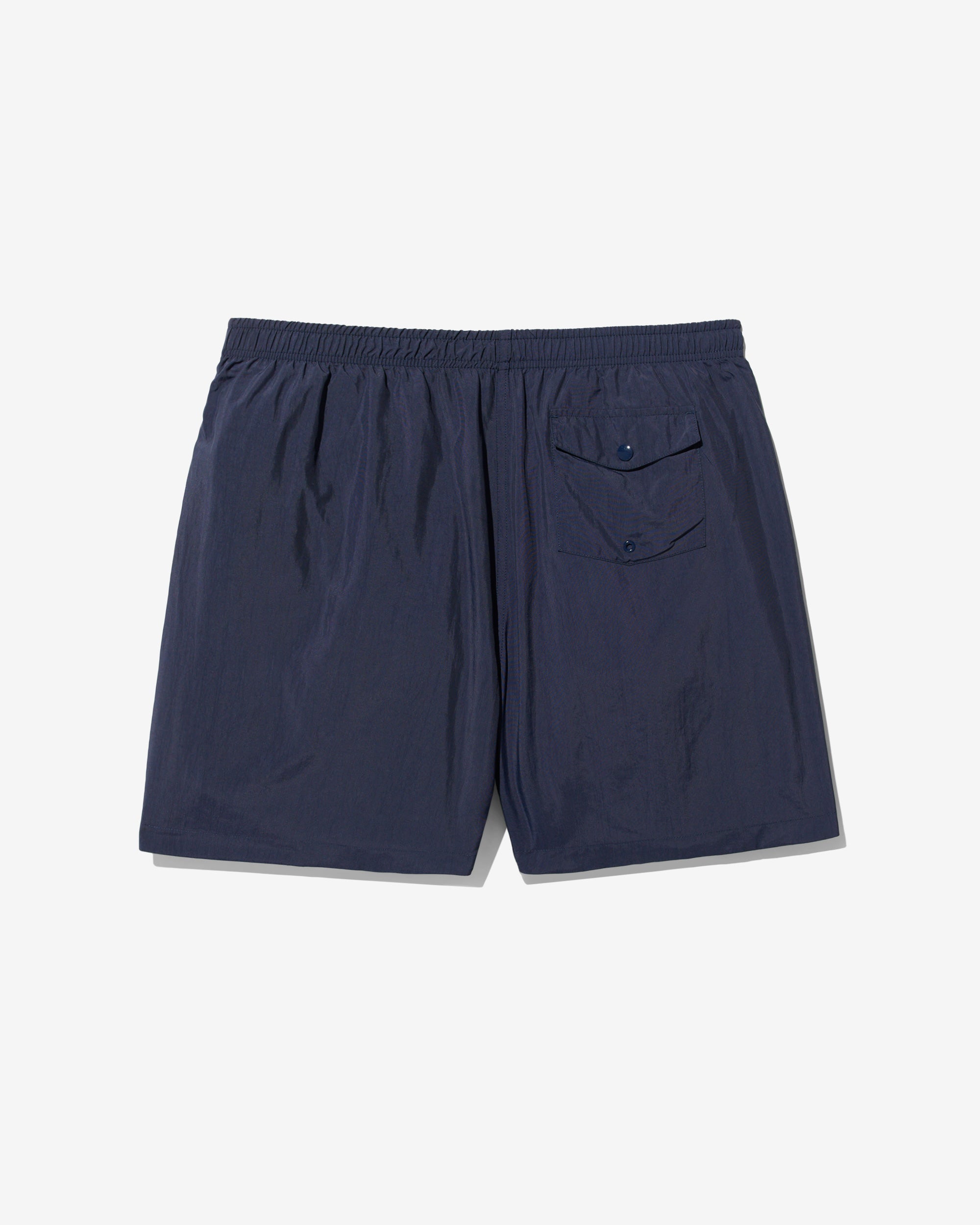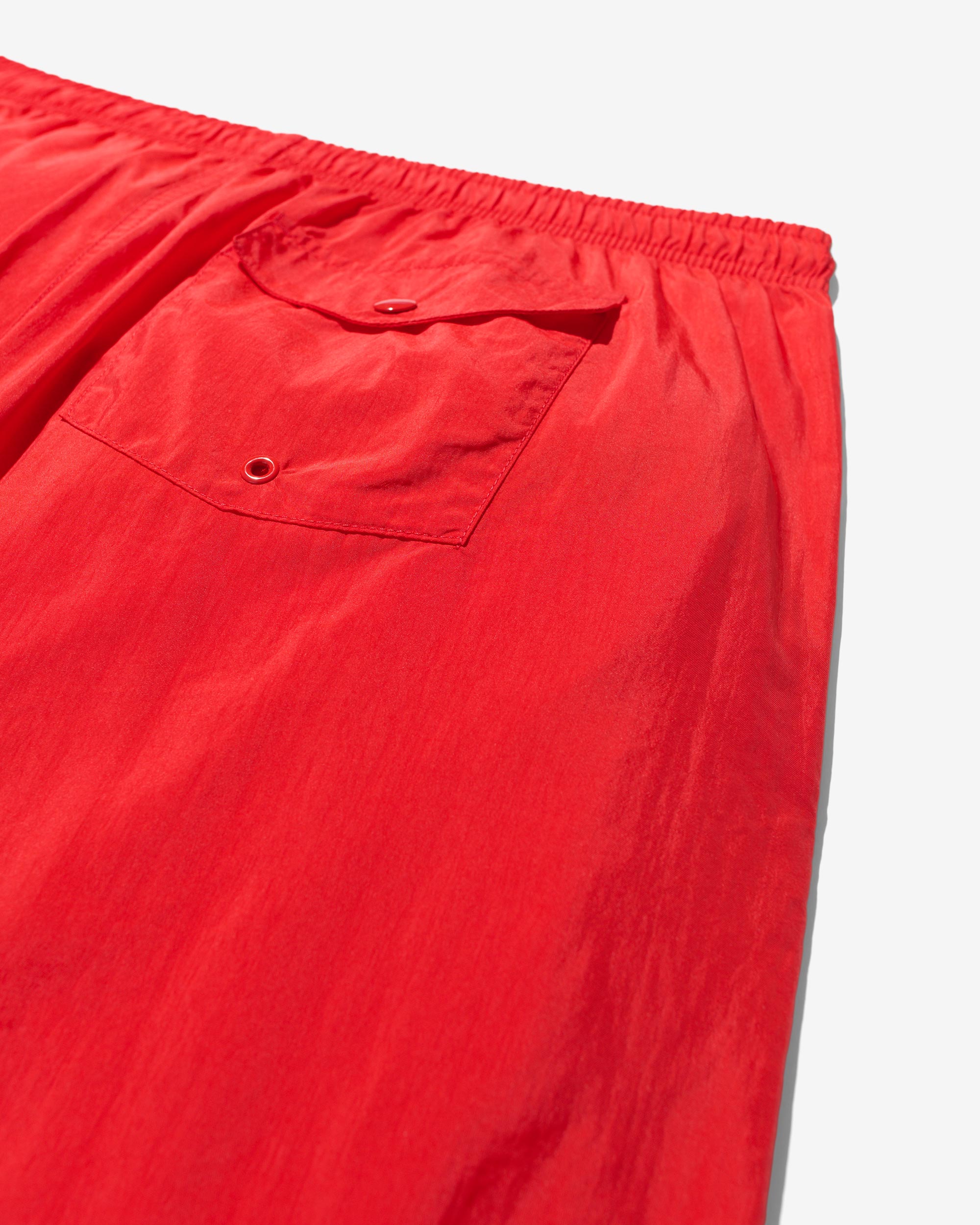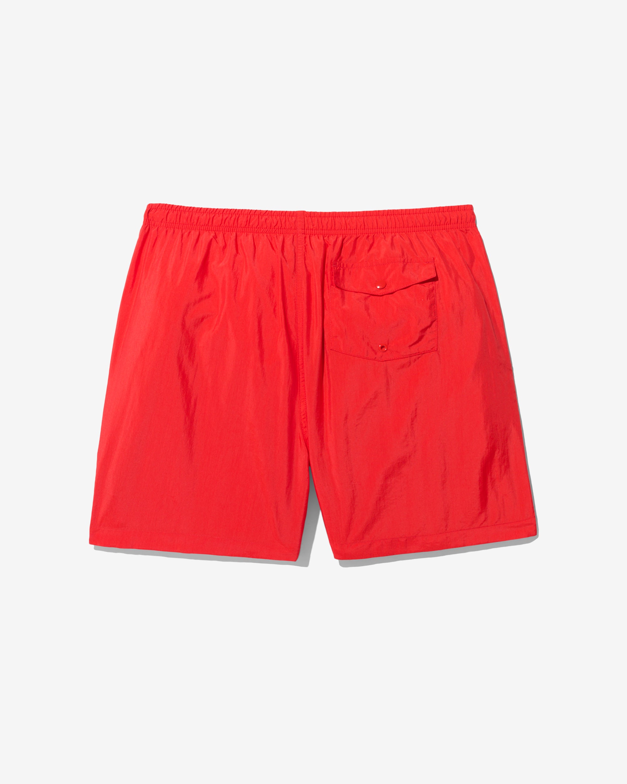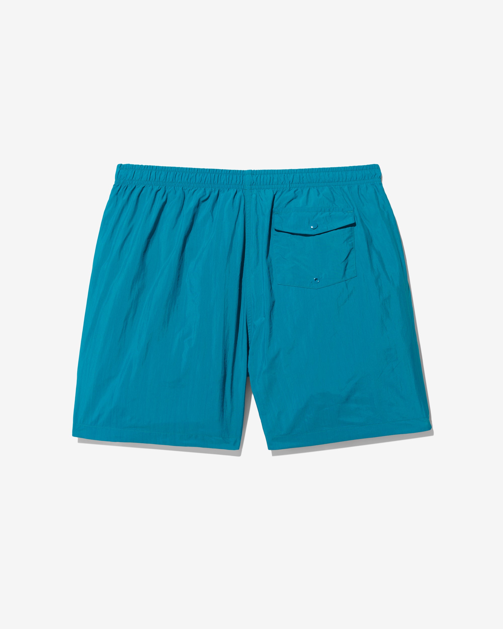 Made in Portugal. 100% crinkle nylon with nylon mesh liner. Elastic drawstring waist. On-seam front pockets. Flap back pocket with snap closure and drain vent
