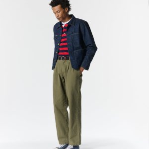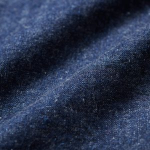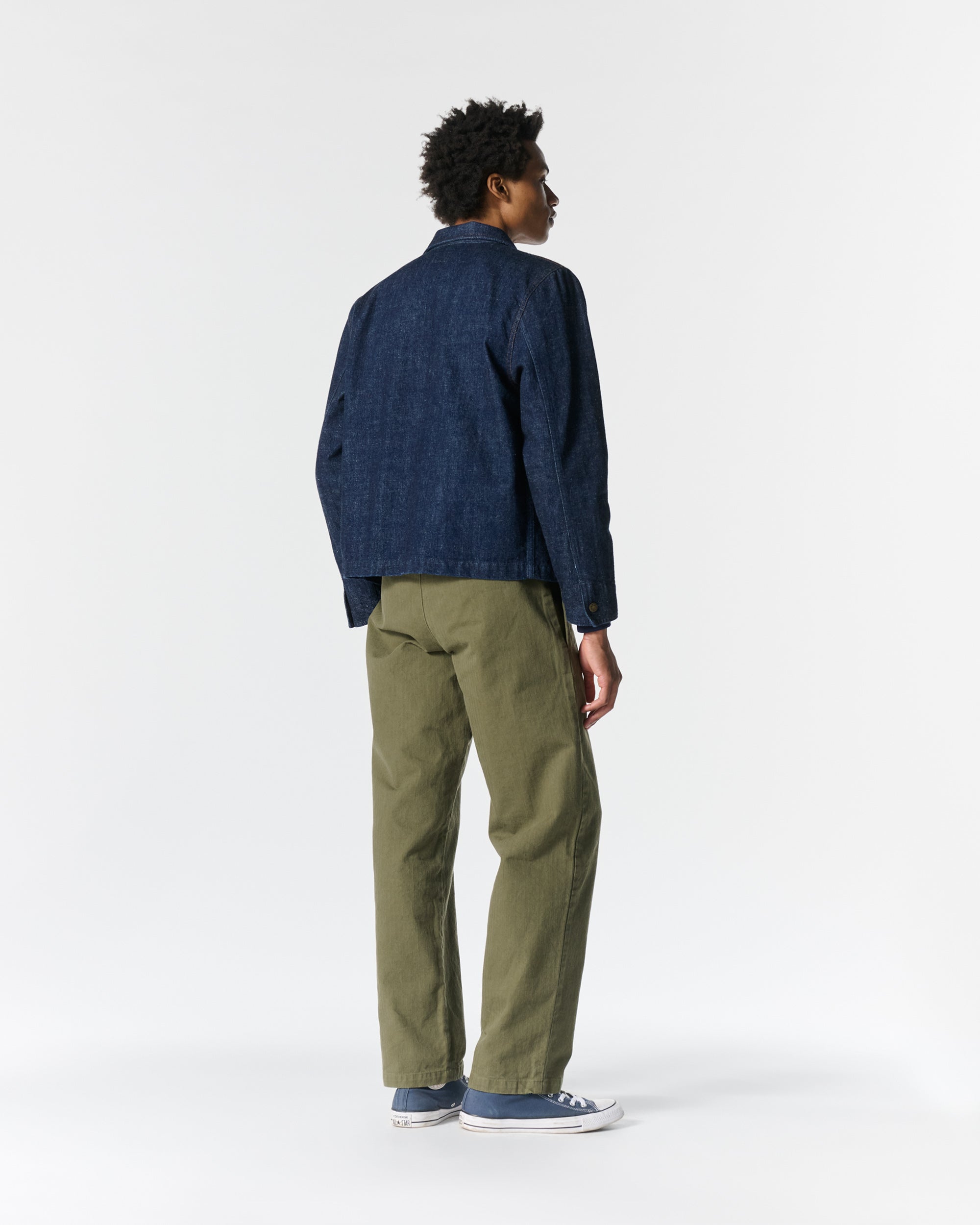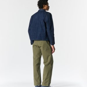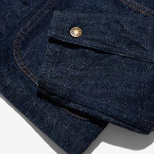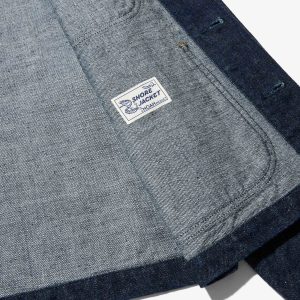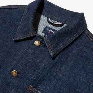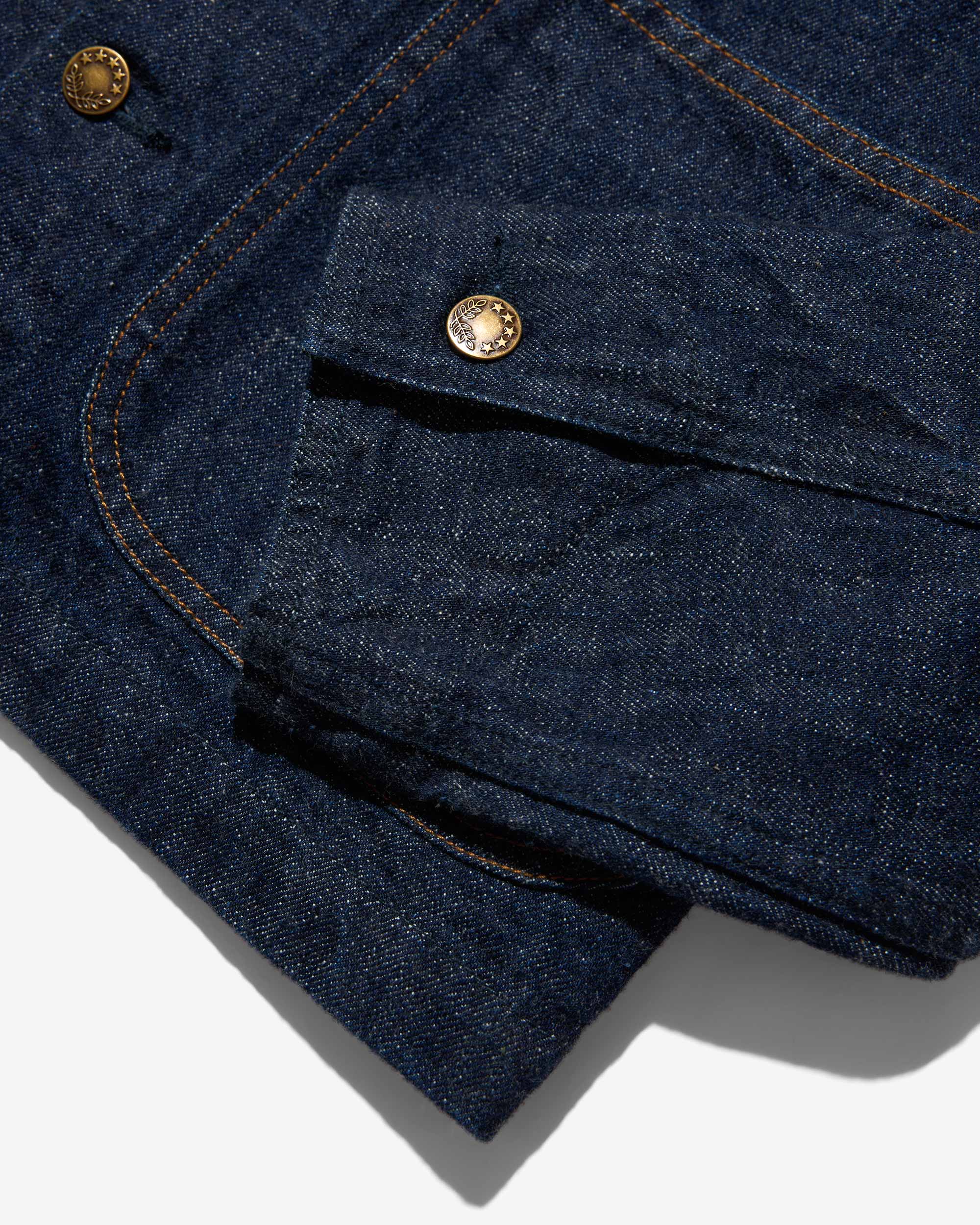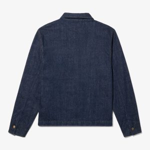 Made in Portugal. 100% ringspun cotton: 60% regular cotton. 20% recycled cotton. 20% fallen cotton. 13.4oz Japanese 3/1 selvedge denim with nep and a sanforized finish. Dyed with natural indigo. Metal shank button closure. Four front patch pockets – one with a button snap flap and logo label. Snap button closure on cuffs. Jamier is 6’1 and wearing a size M. Hannah is 5’8 and wearing a size M