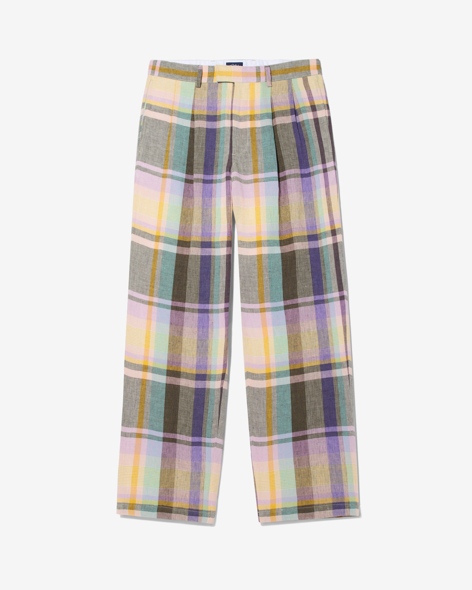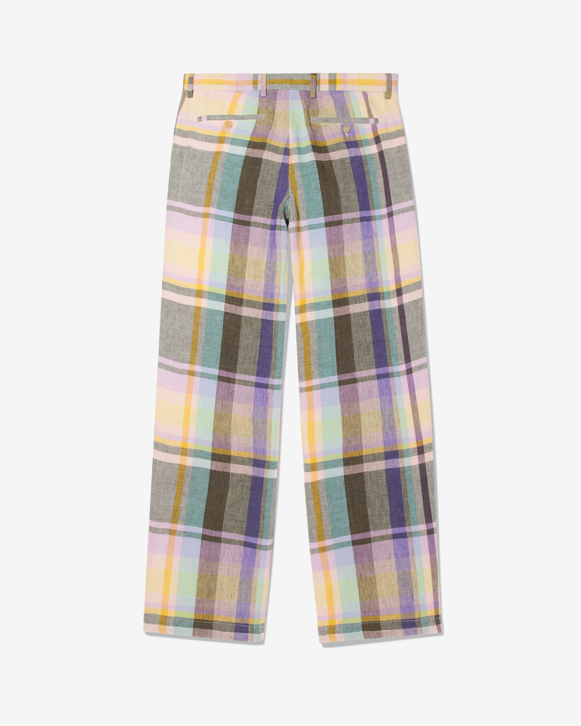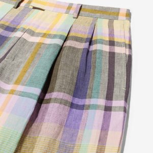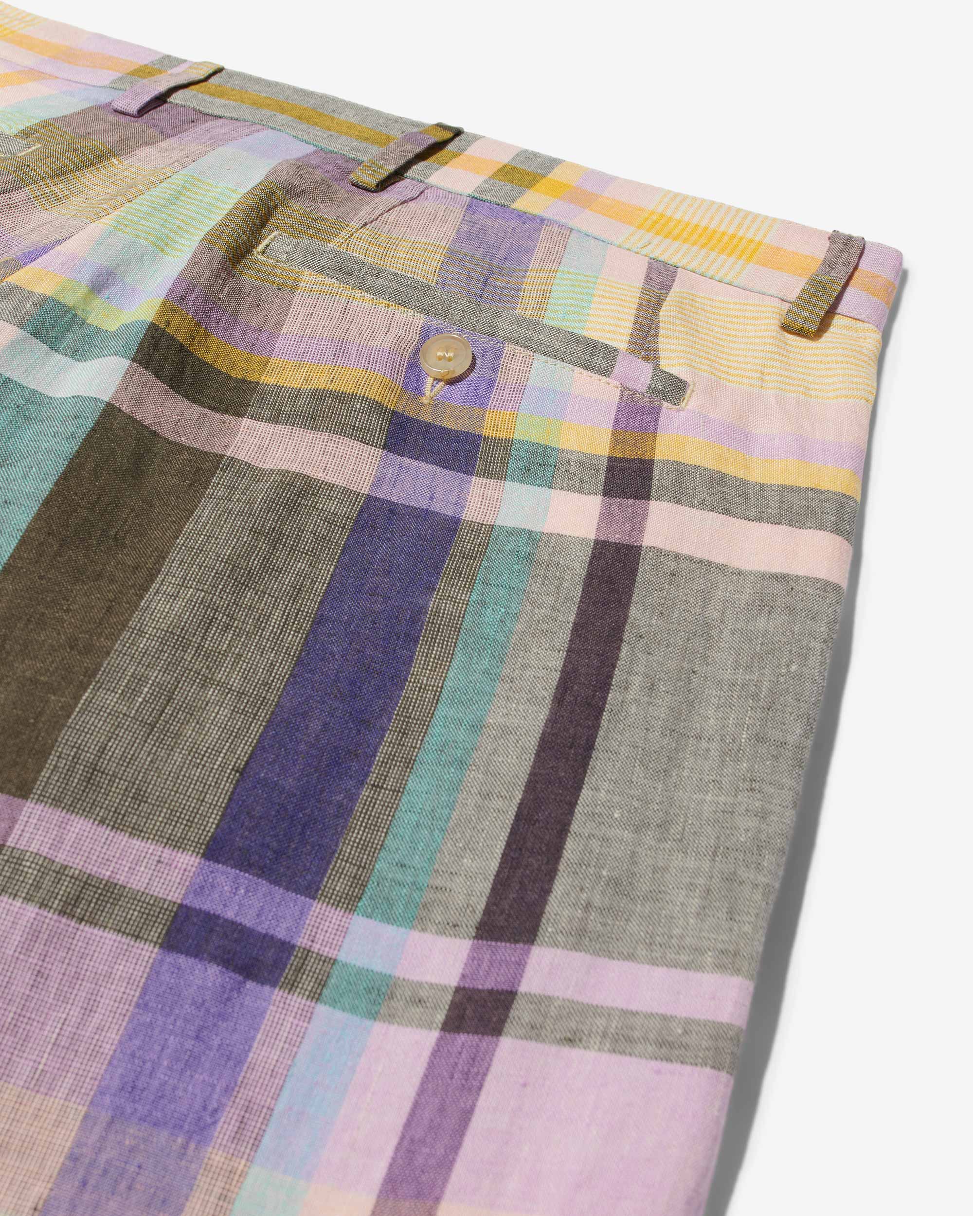 Made in Italy. 100% Italian linen with yarn-dyed plaid made exclusively for Noah. Double-pleated with zip-fly and metal hook & eye closure. Besom pockets on back with button-closure. Final sale.Â