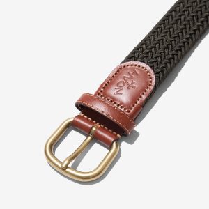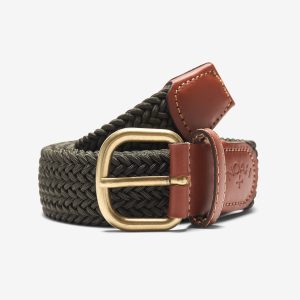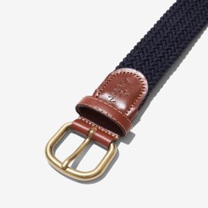 Made in Italy. Woven elasticated nylon cords. Leather trim. 1 3/8 wide.Solid brass hardware
