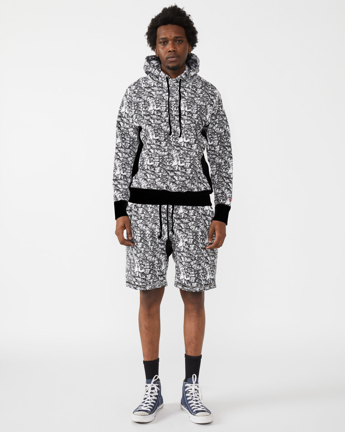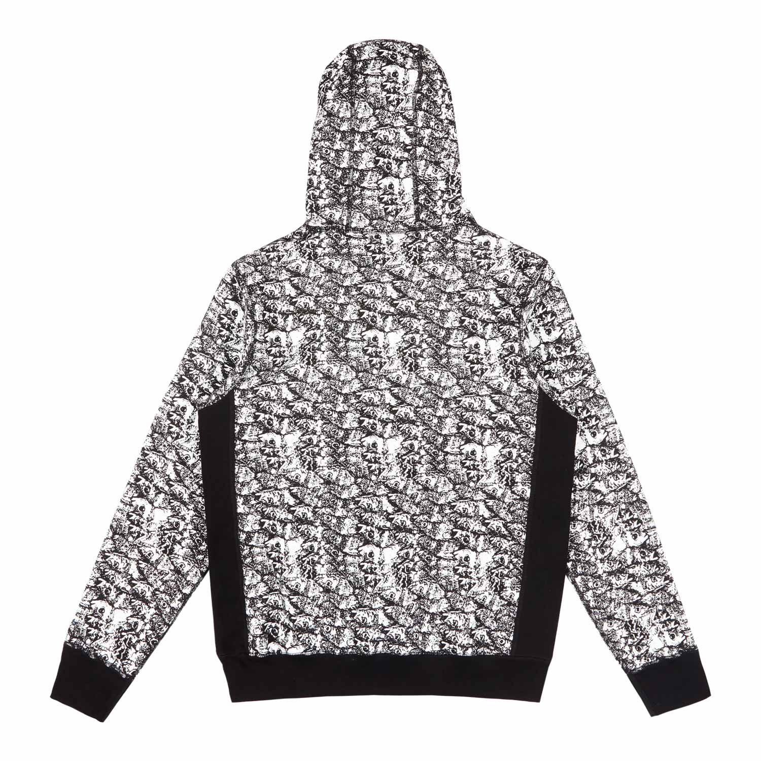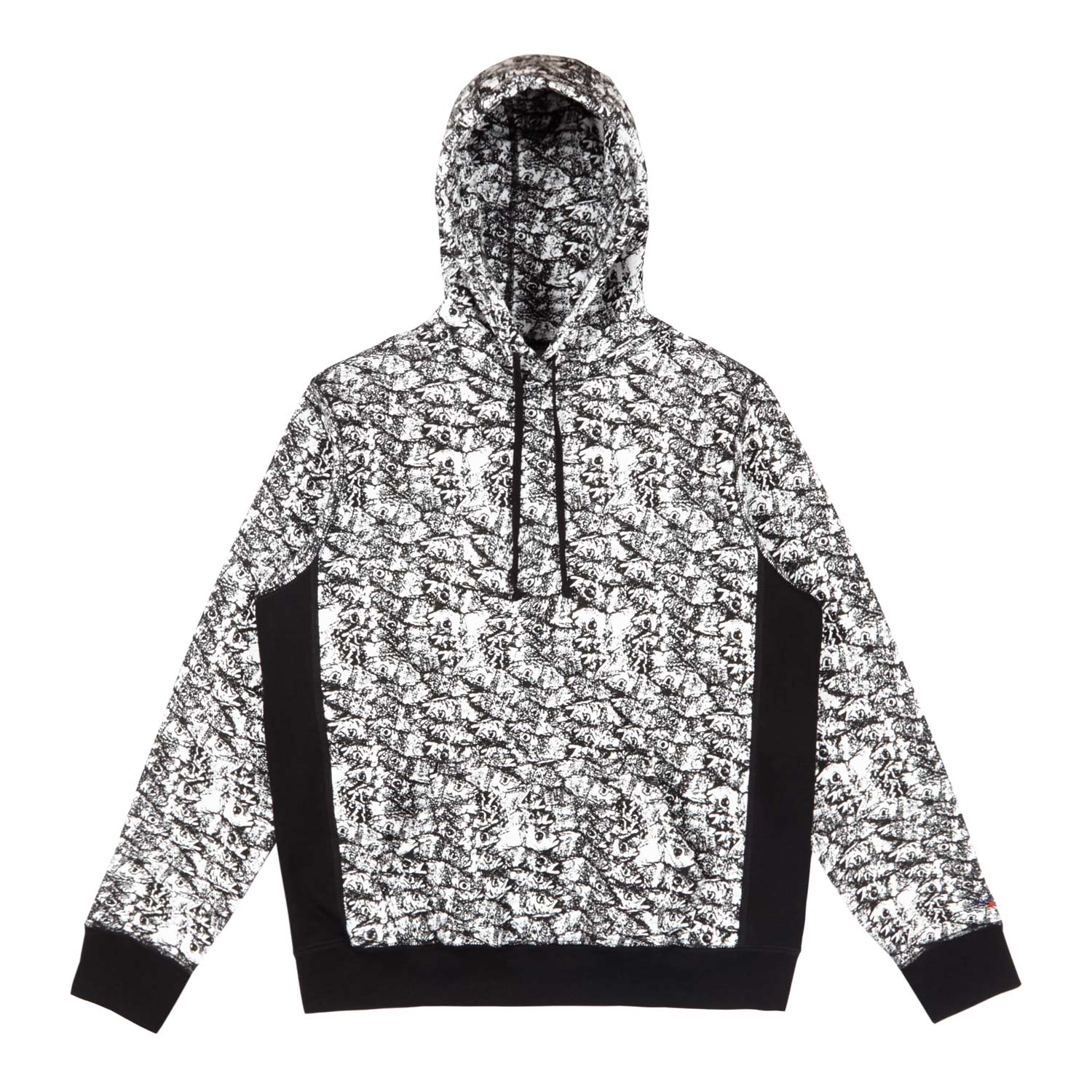Made in Canada. 100% cotton. 12 oz. brushed-back fleece with allover print. Adjustable hood. ribbed cuffs and hem. kangaroo pocket. Embroidered logo on wrist.