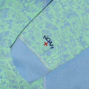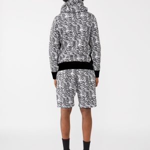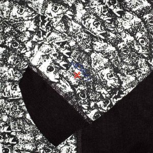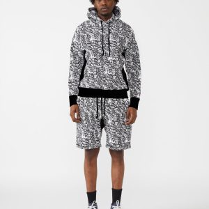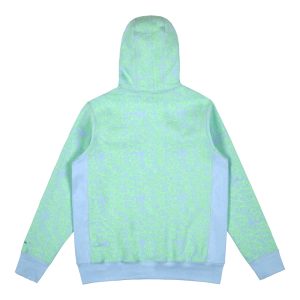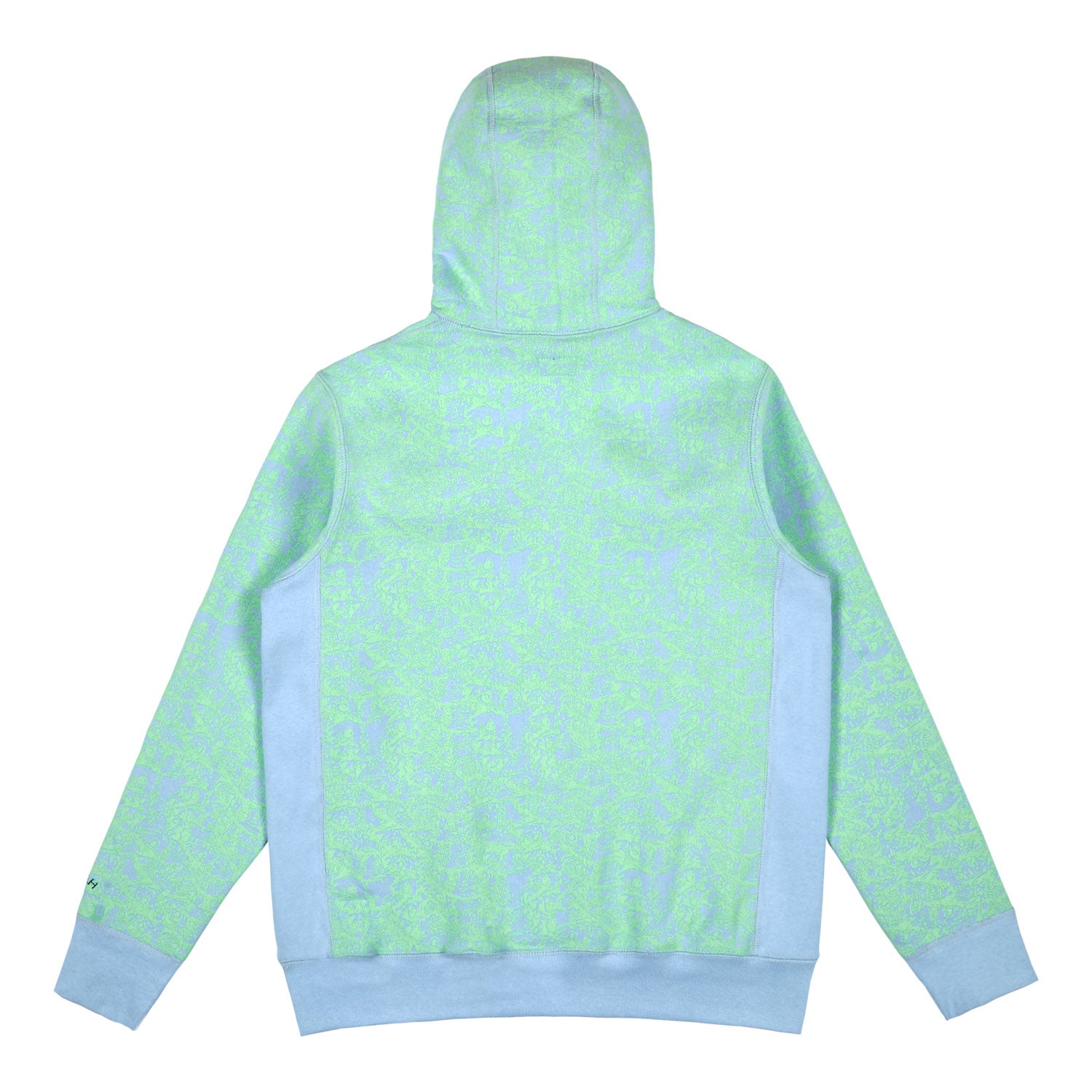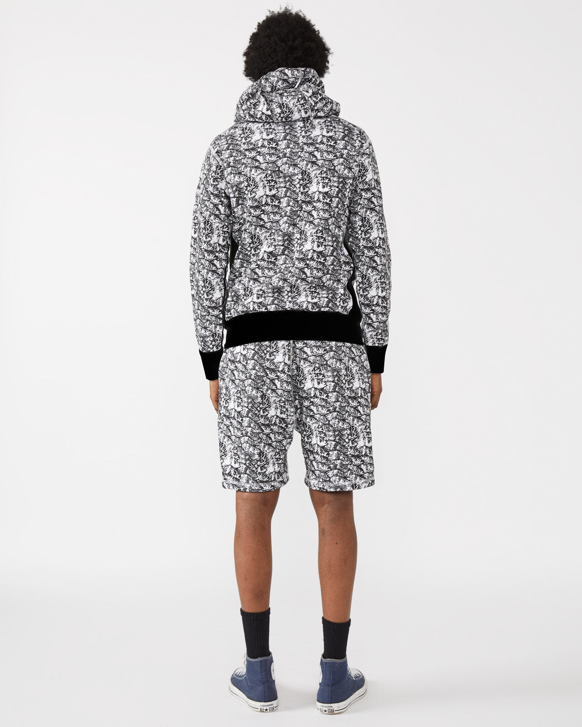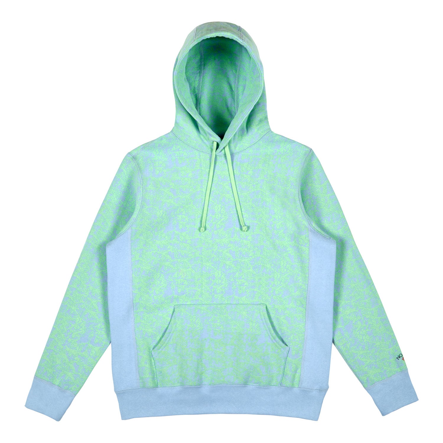 Made in Canada. 100% cotton. 12 oz. brushed-back fleece with allover print. Adjustable hood. ribbed cuffs and hem. kangaroo pocket. Embroidered logo on wrist.