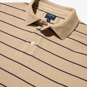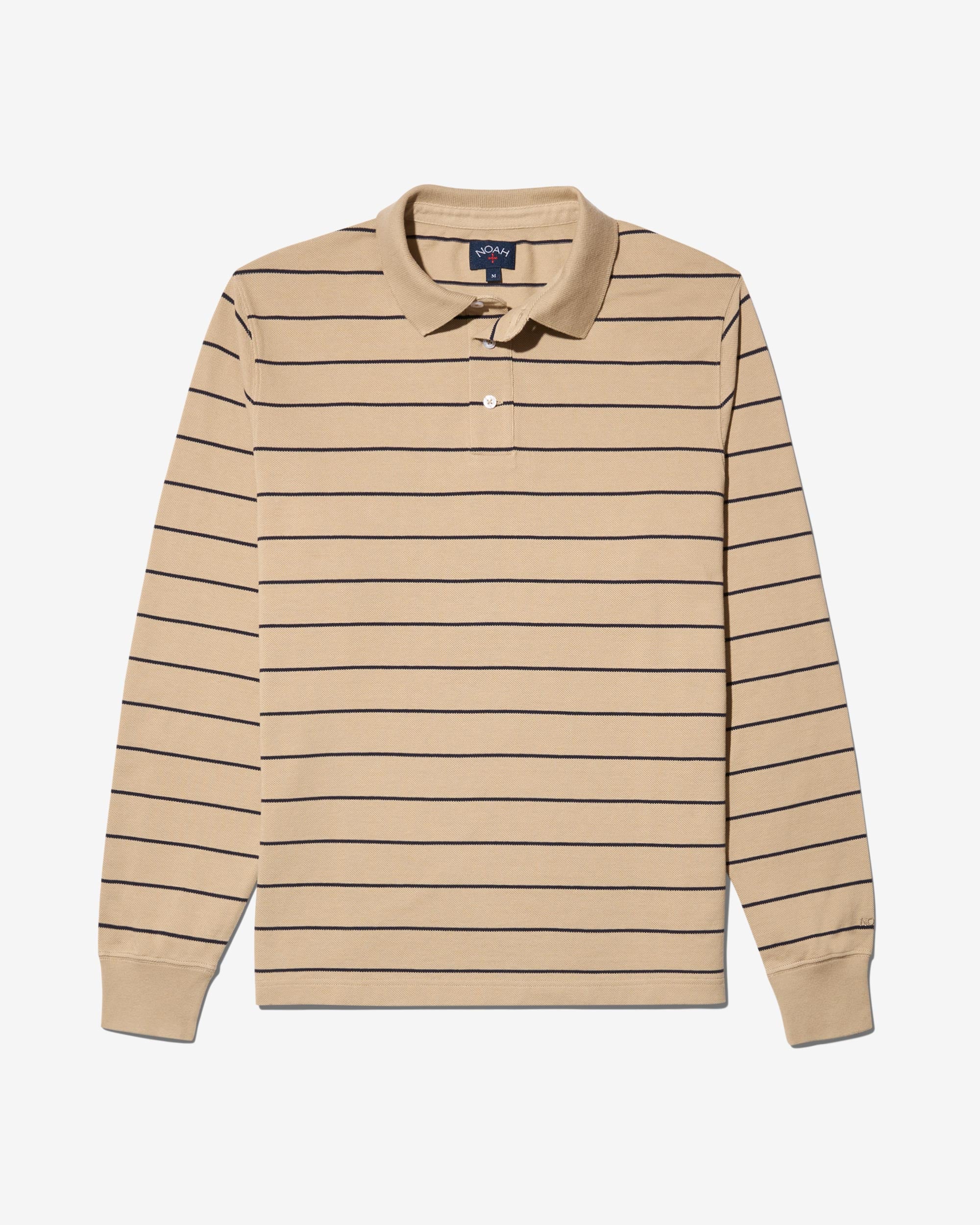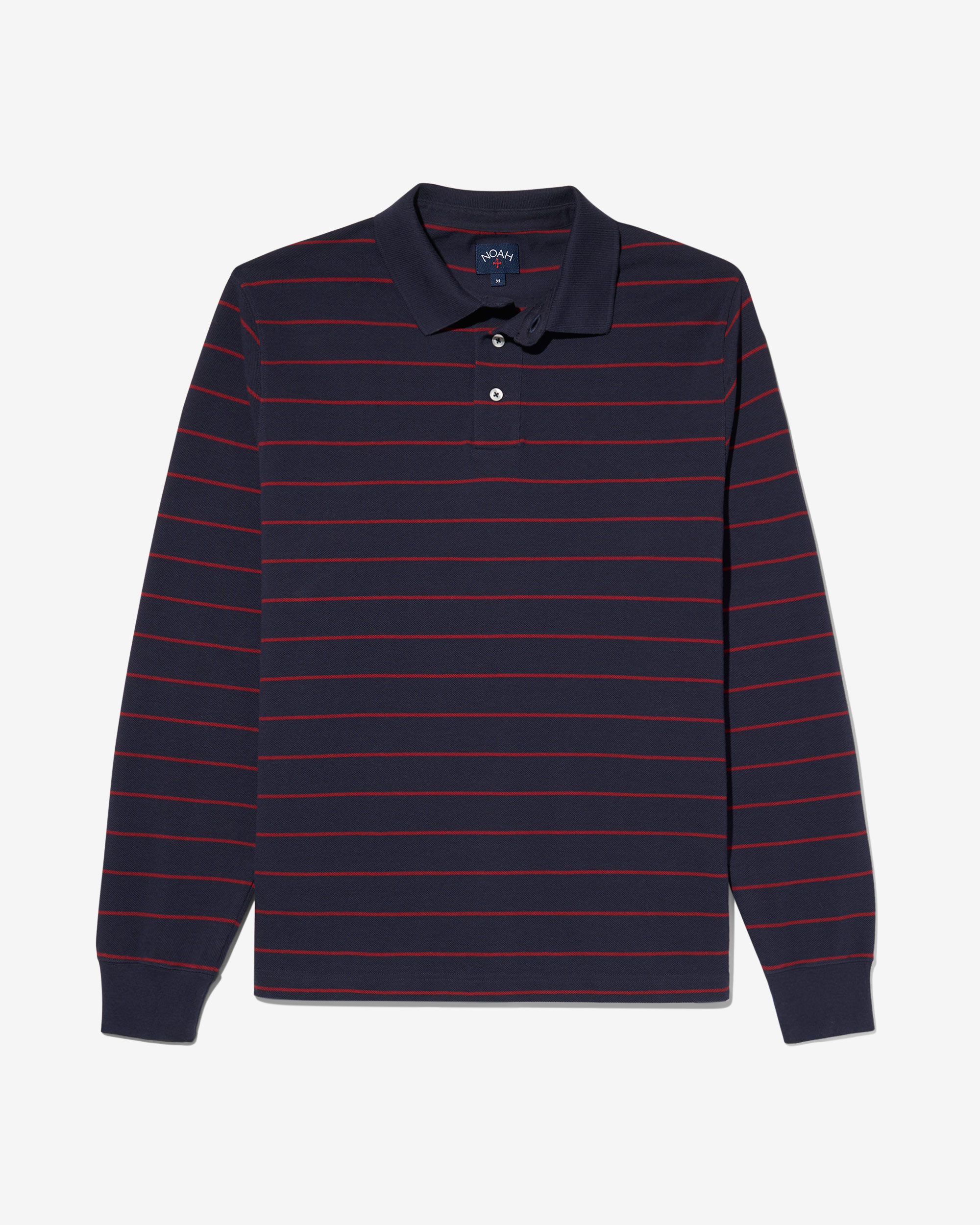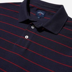 Made in Portugal. 100% cotton heavyweight piqué. 310 GSM. Flat knit collar with three-button placket. Engineered stripes. Split hem with side vents. Rib knit sleeve opening. Embroidered logo above cuff