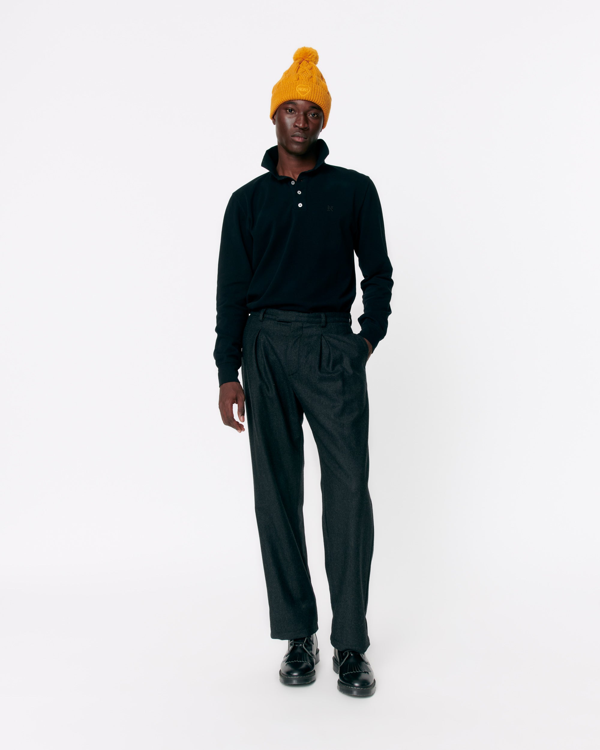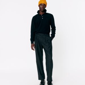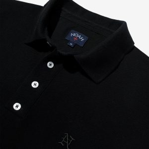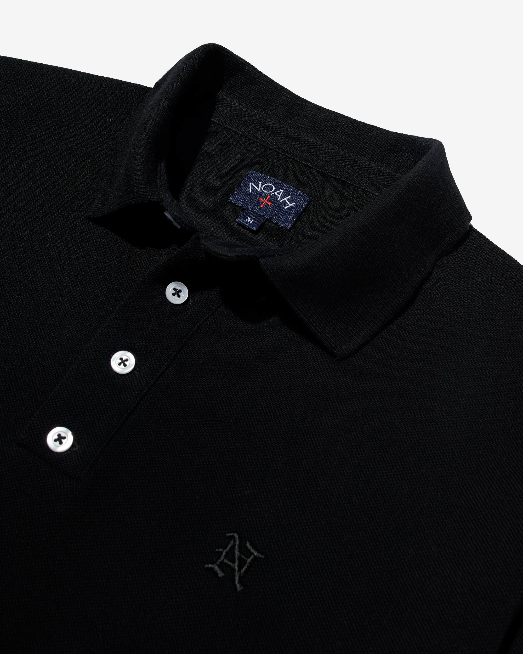 Made in Portugal. 100% cotton heavyweight piqué. Four-button placket with polo collar. Flat knit collar and cuffs. Side vents at hem. Embroidered graphic on chest.