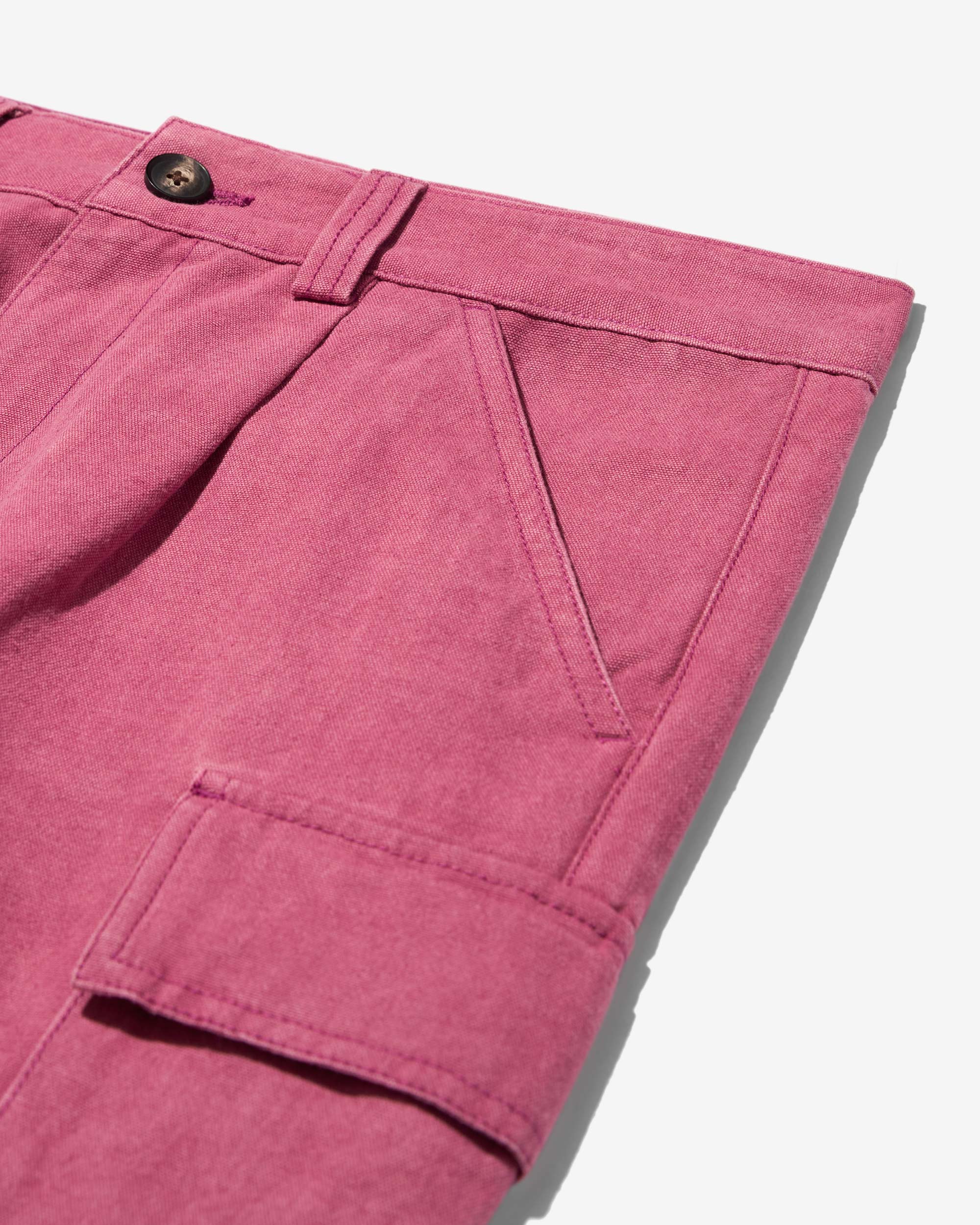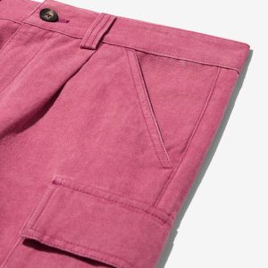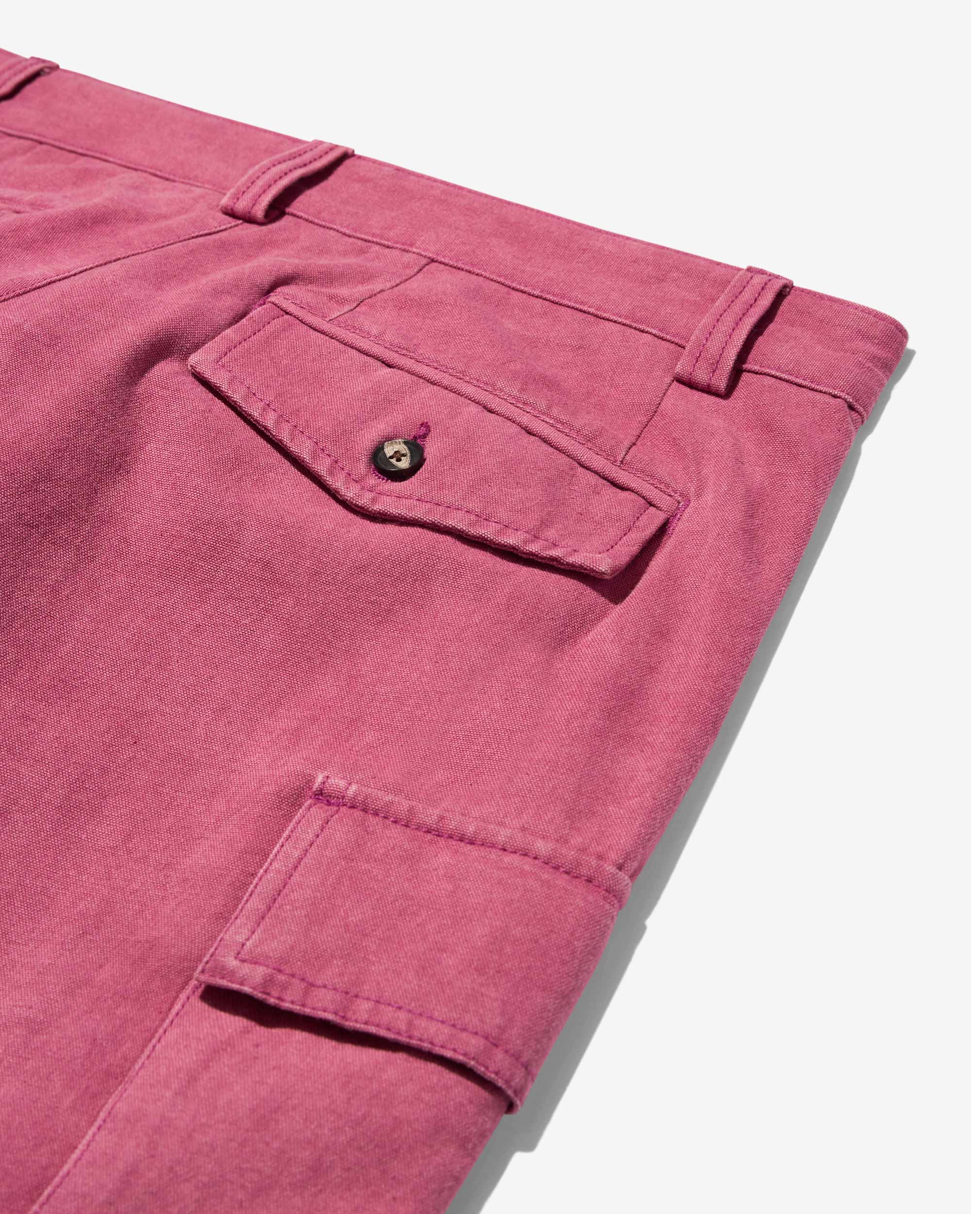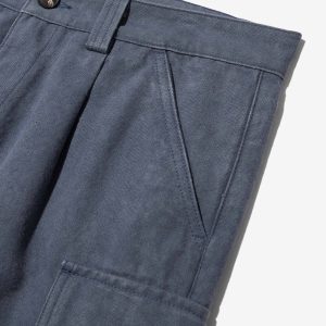 Made in Portugal. 100% organic washed cotton canvas from Spain. Single front pleat with zip fly and button closure. Slanted front pockets and cargo side seam pockets. Back flap pockets with button closures. Jamier is 6’1 and wears a size 32