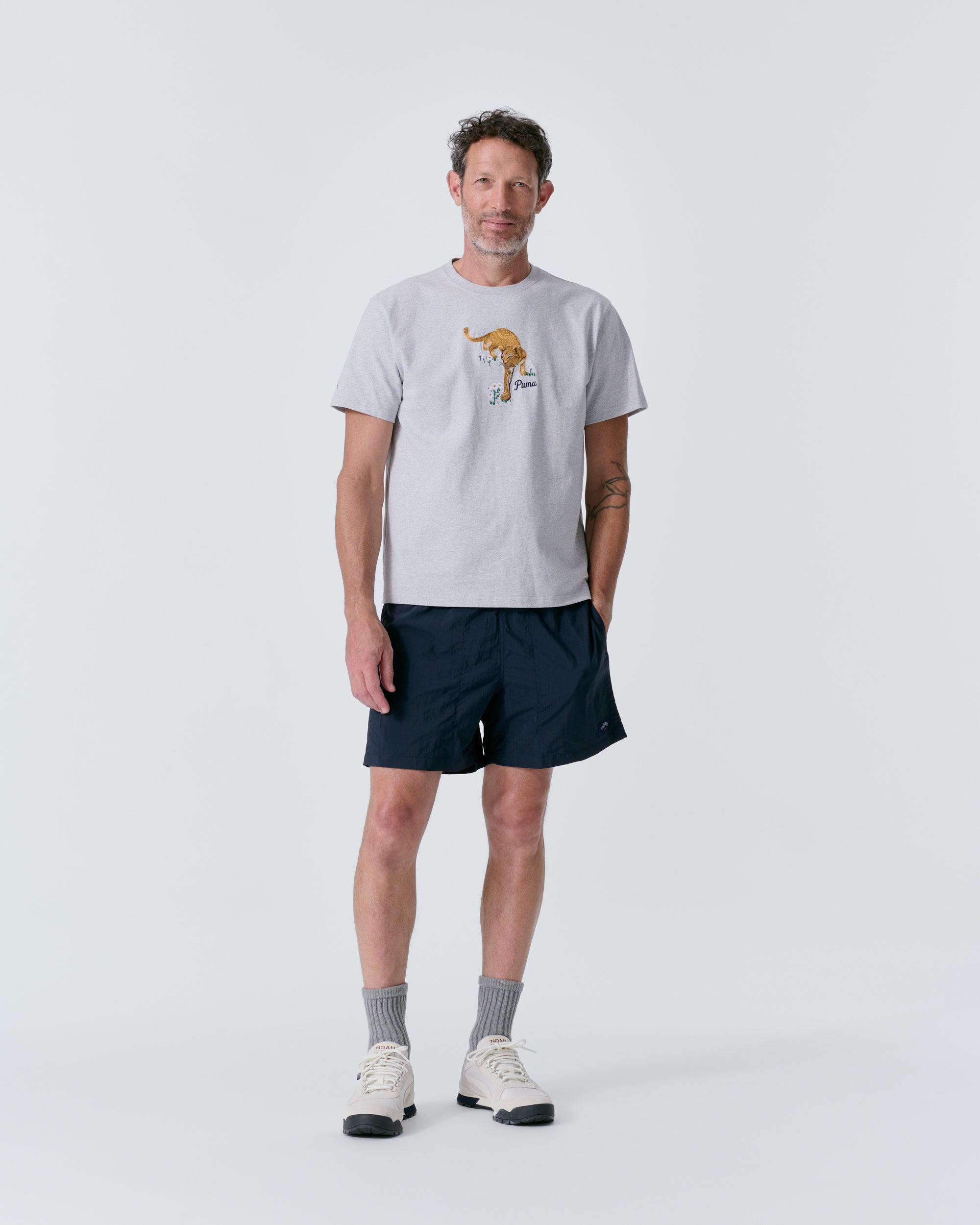 Made by Puma exclusively for Noah. 100% cotton (30% recycled cotton) 250g single jersey. Embroidered graphic on chest. Printed logo on sleeve. Neil is 6’1 and wearing size M