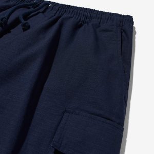 Made in Portugal. 100% cotton ripstop. Elasticated drawstring waist. Two front slant pockets. two side cargo pockets and one back patch pocket. Neil is 6’1 and wearing size M
