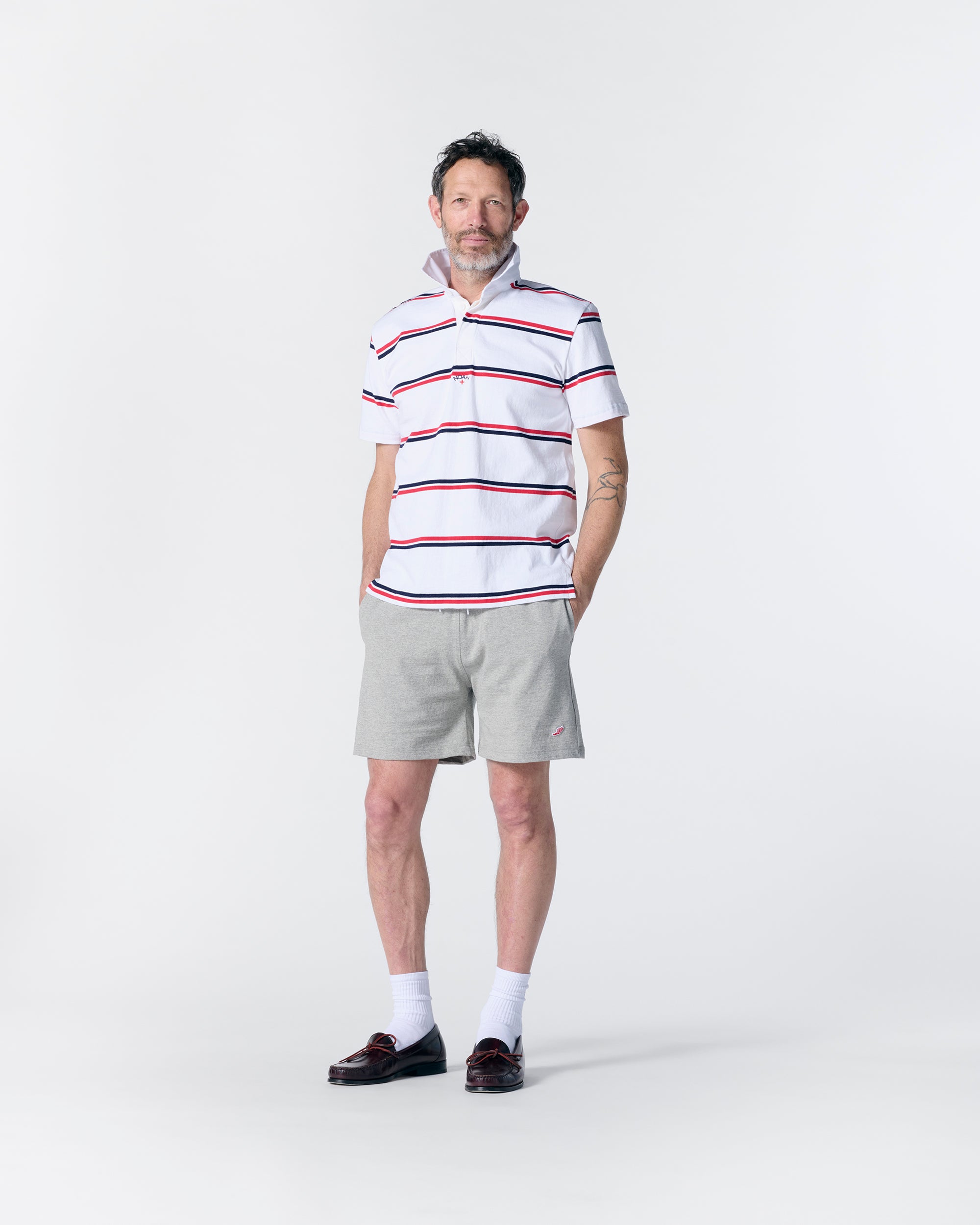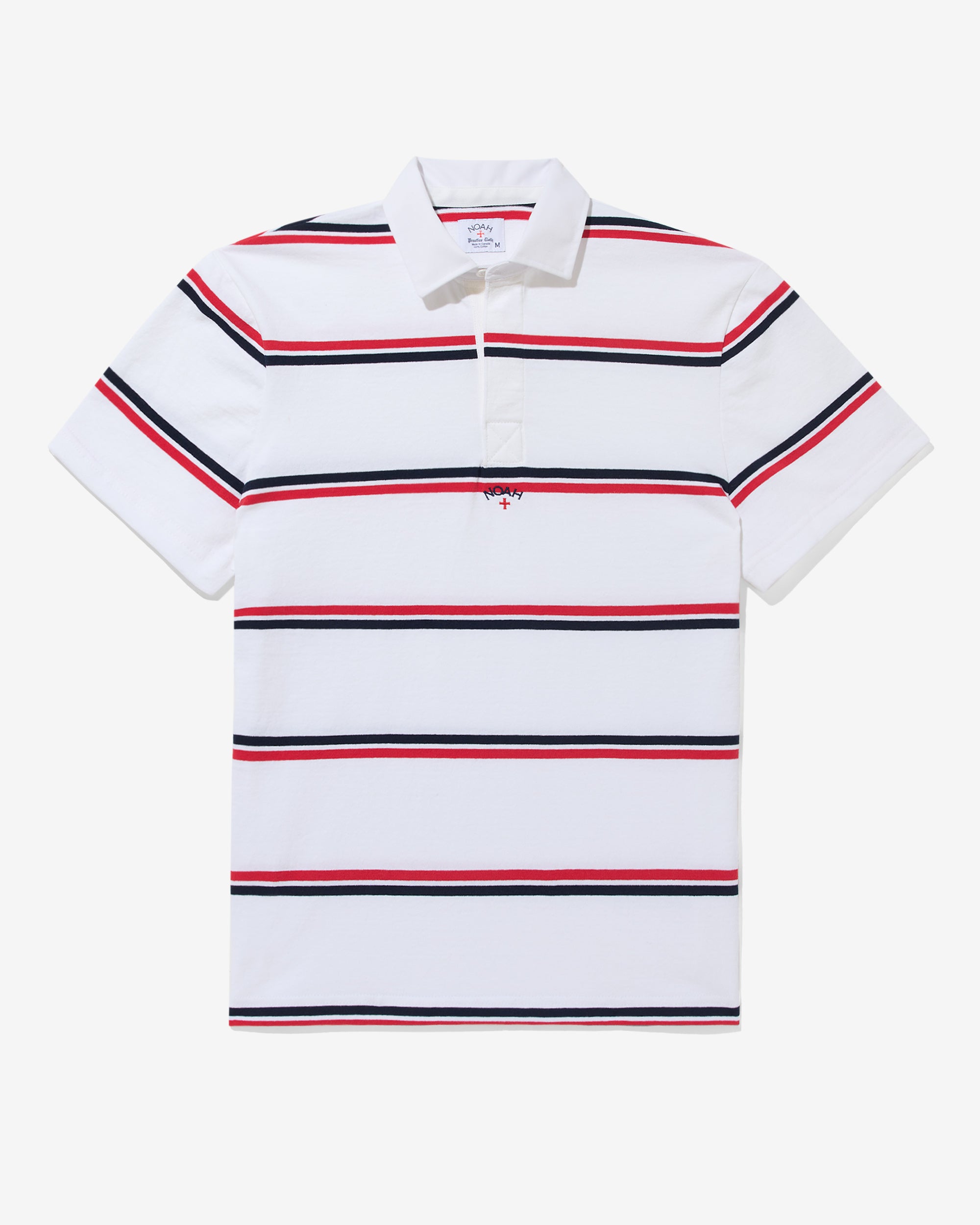 Made in Canada. 100% cotton. 8.0 oz Practice Cloth with engineered stripes. Rib knit collar. Embroidered logo below placket. Final sale. Neil is 6’1 and wearing size M