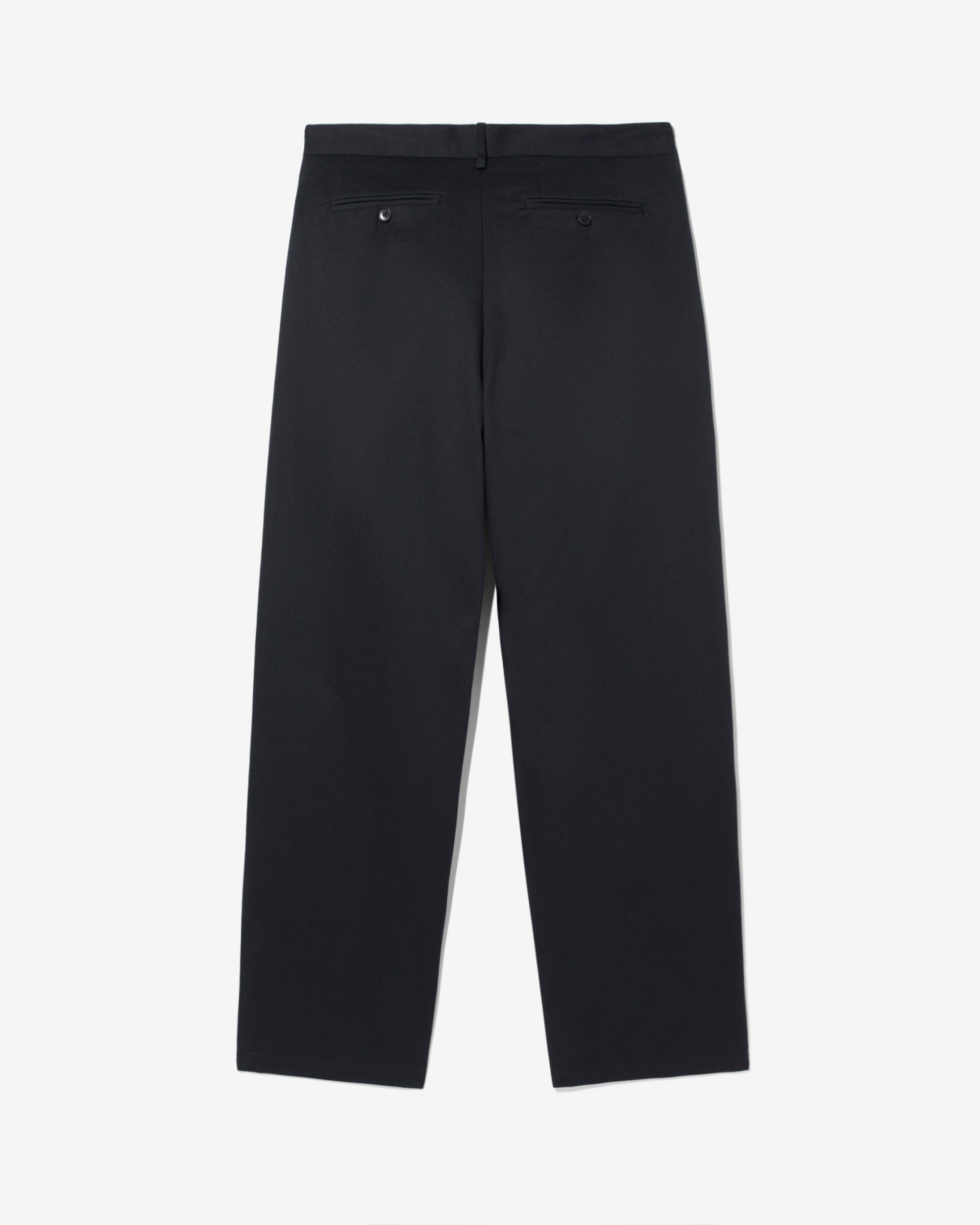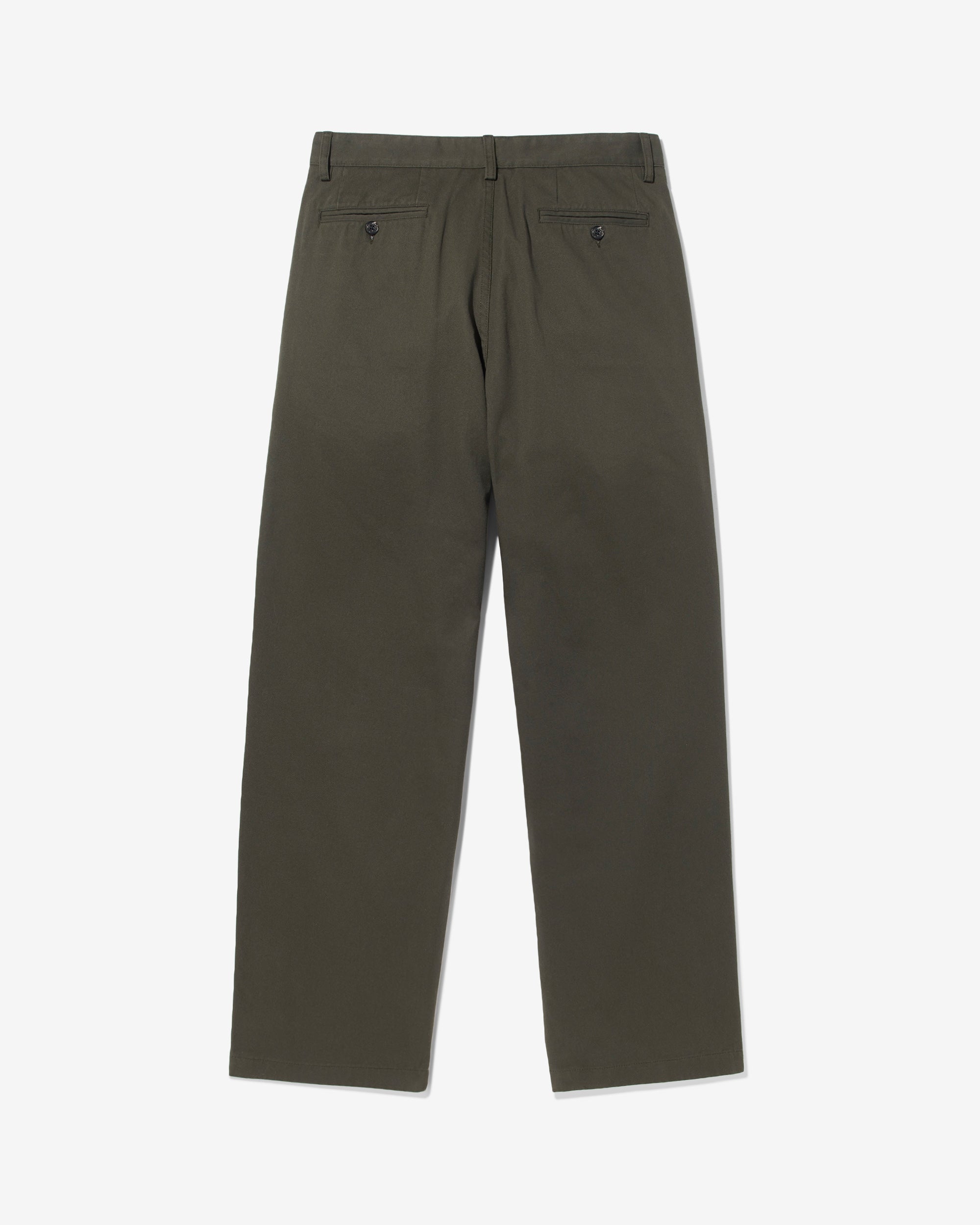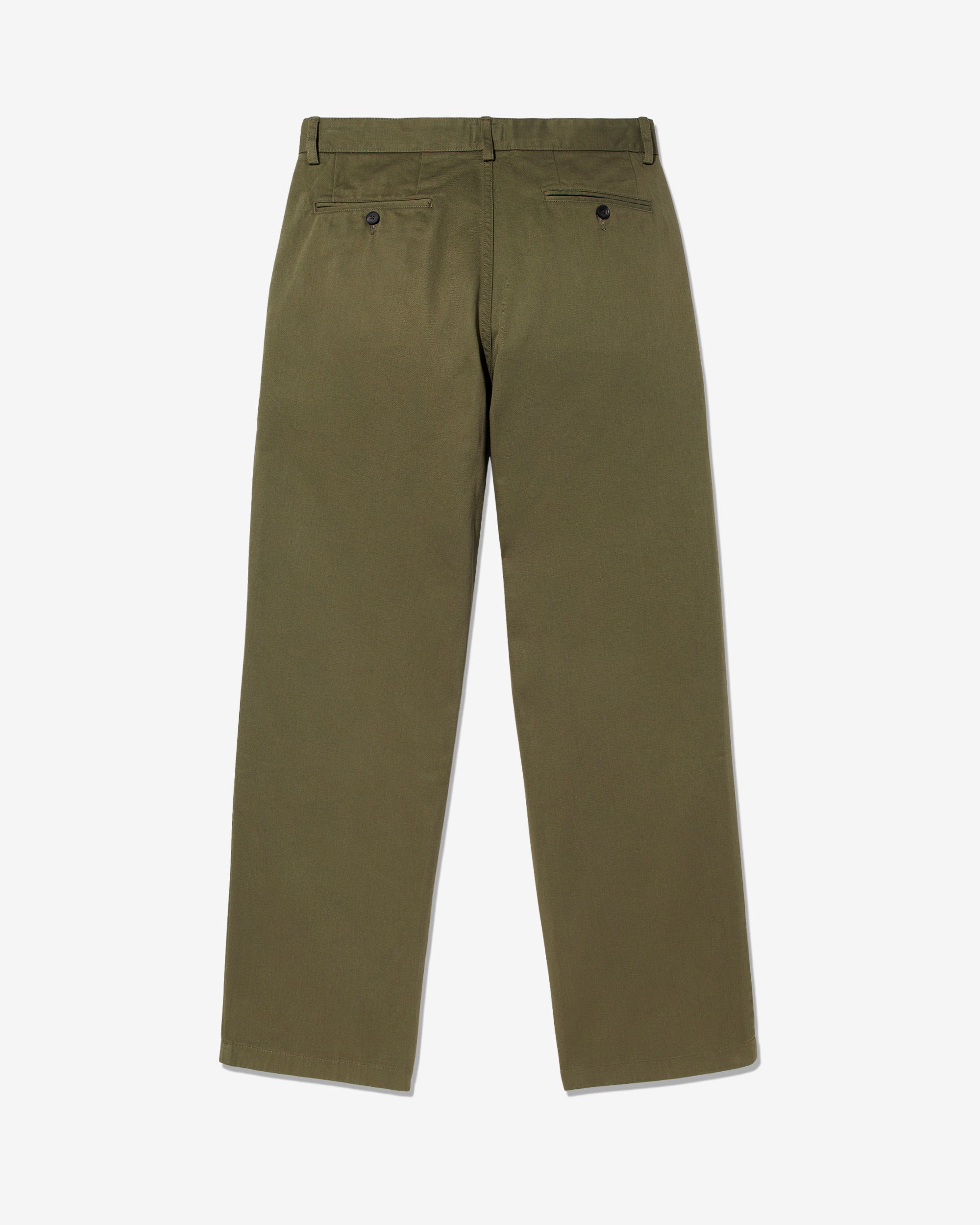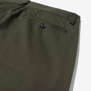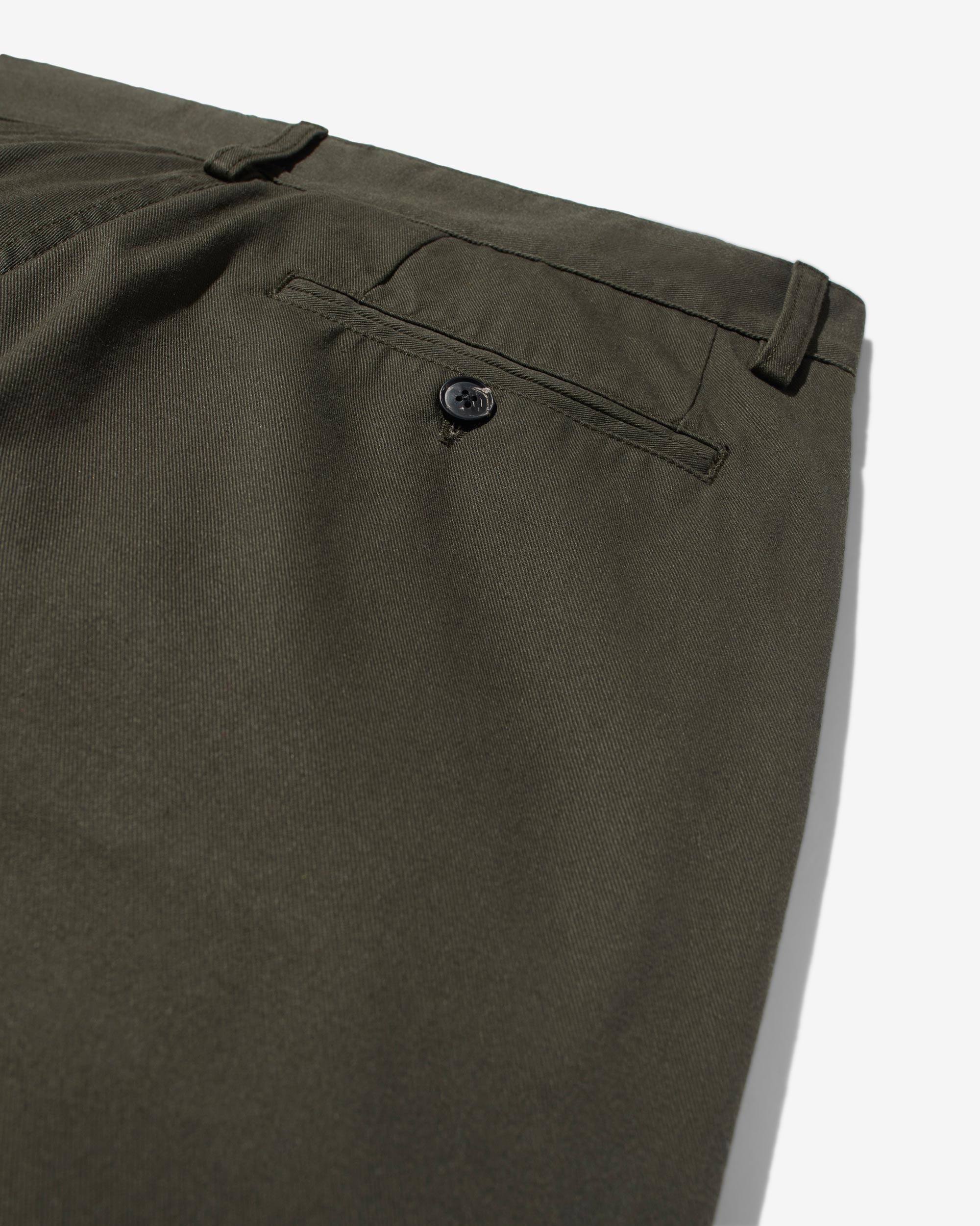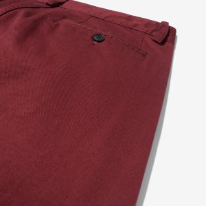 Made in Portugal. 100% cotton twill. Double-pleated with zip-fly and button-closure. Side seam front pockets and besom back pockets with button closure. Nile is 6’2 and wearing size 32
