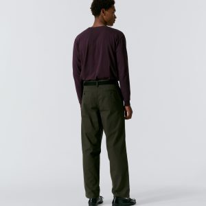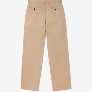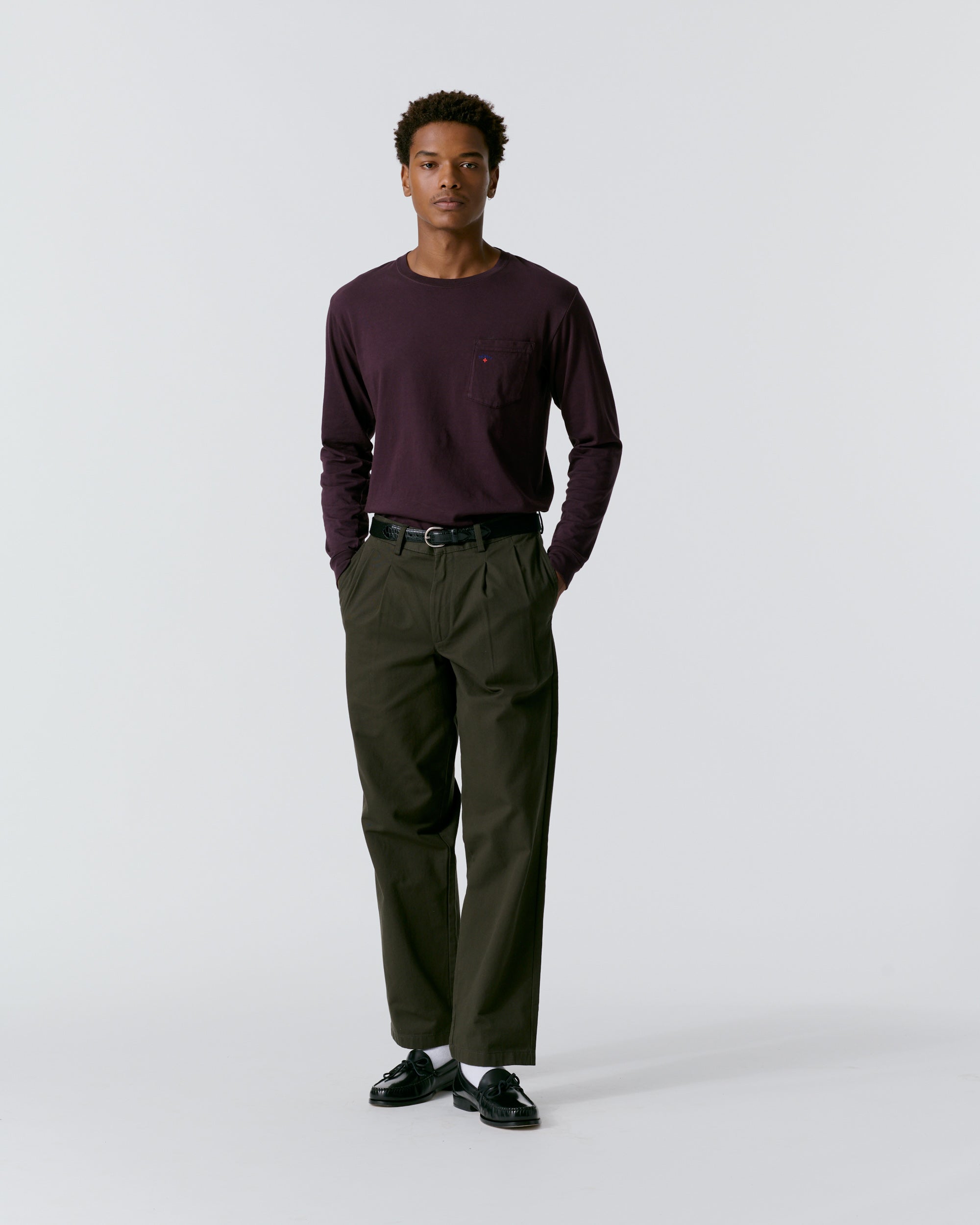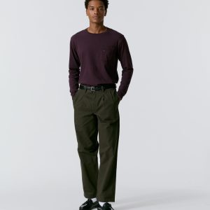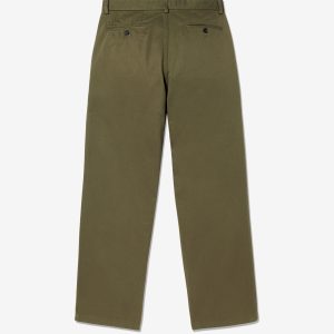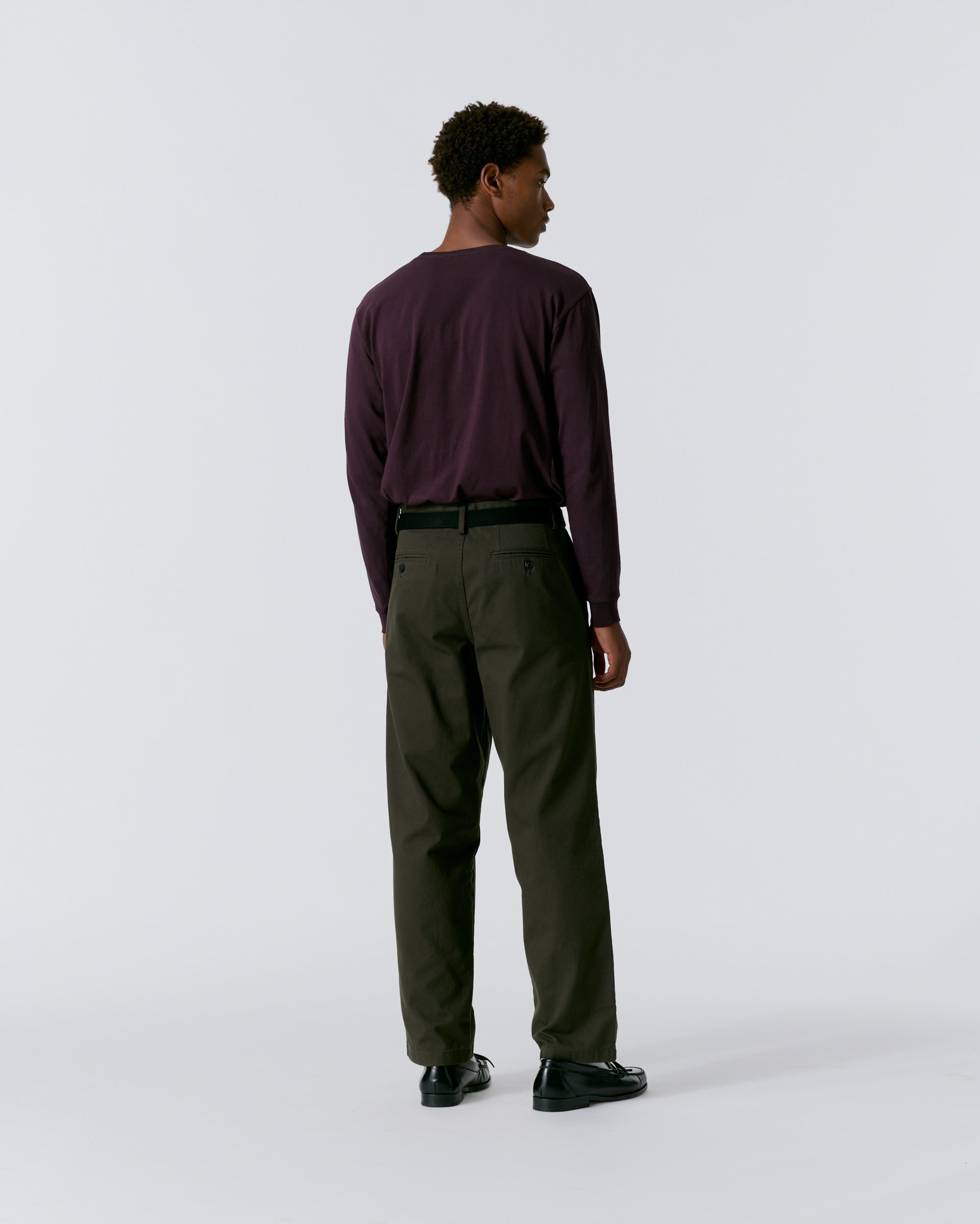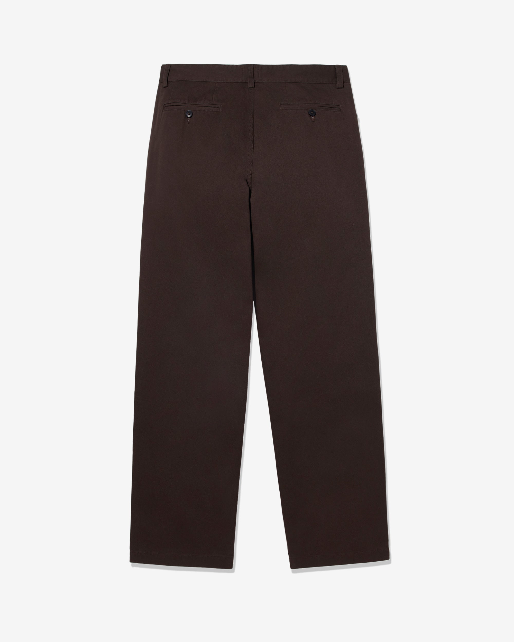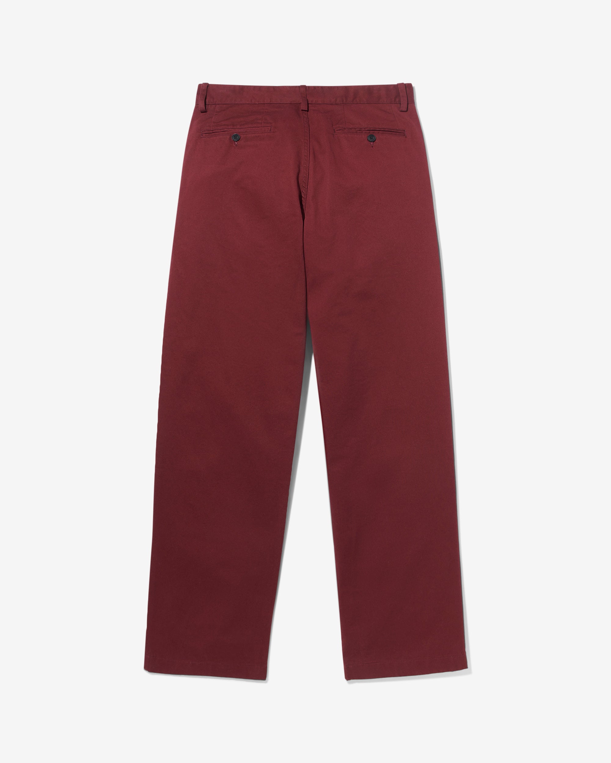 Made in Portugal. 100% cotton twill. Double-pleated with zip-fly and button-closure. Side seam front pockets and besom back pockets with button closure. Nile is 6’2 and wearing size 32